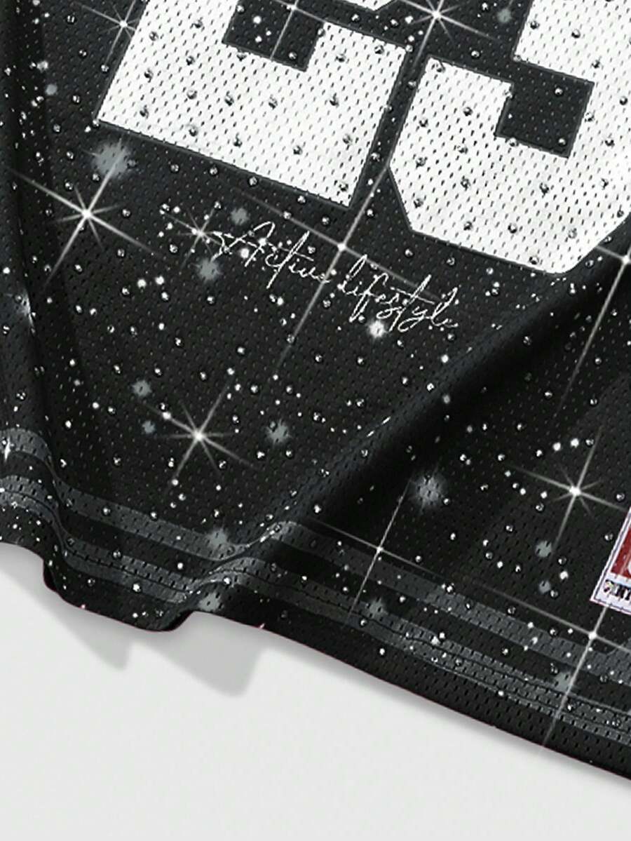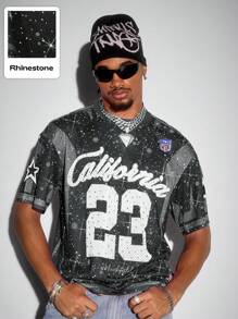 Prep T-shirt da uomo estiva nuova edizione, interamente stampata a tutto campo, con applicazioni di strass, design ispirato allo streetwear e allo sport, con testo "California" in caratteri corsivi sovradimensionati, numero "23" e grafiche a forma di stella prominenti