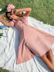 Vestito lungo da donna con maniche a palloncino, nodo anteriore, busto arricciato, spacco sulla coscia