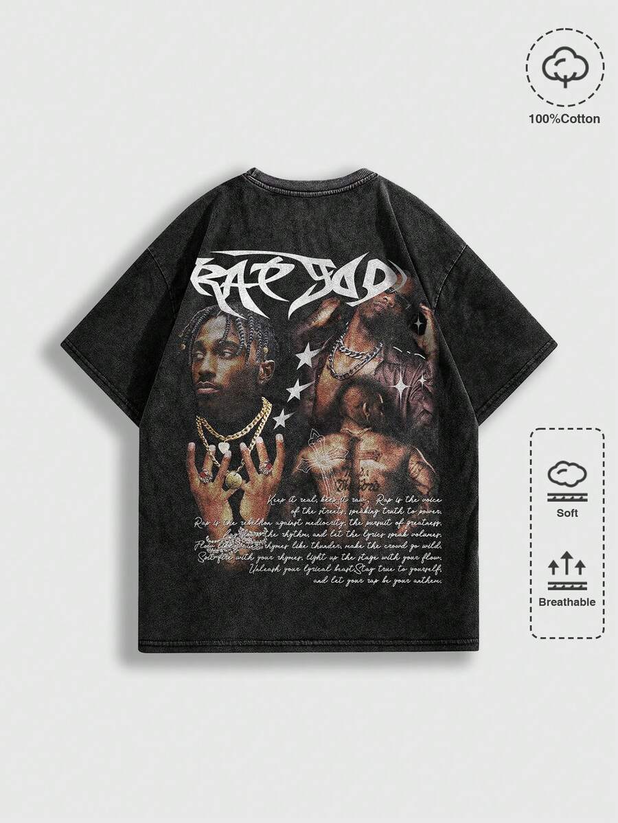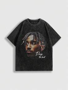 Maglietta girocollo a maniche corte con stampa di slogan e ritratto in stile punk