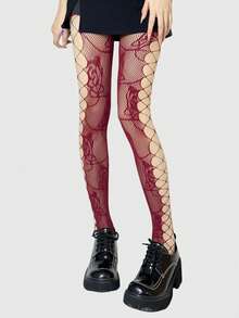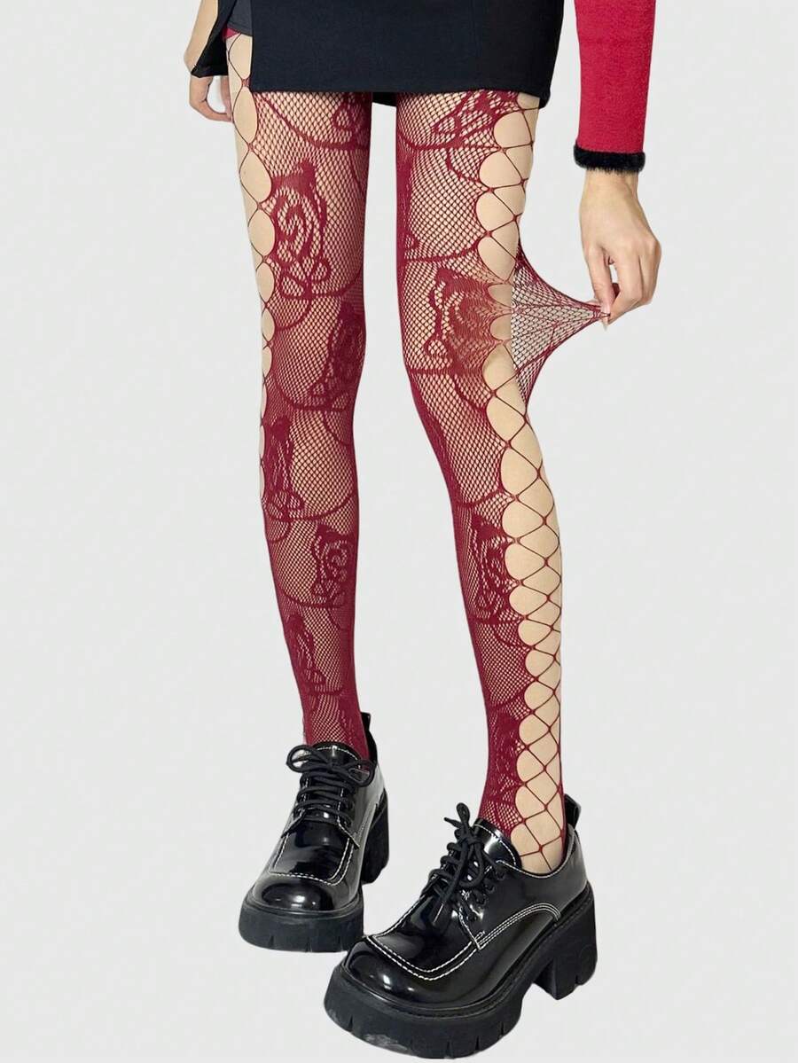 ROMWE Avant 1 Paio Di Sexy Calze A Rete In Pizzo Floreale, Calze Parigine Bordeaux Retrò Con Lati Traforati, Calze Trasparenti Leggere Ed Elastiche
