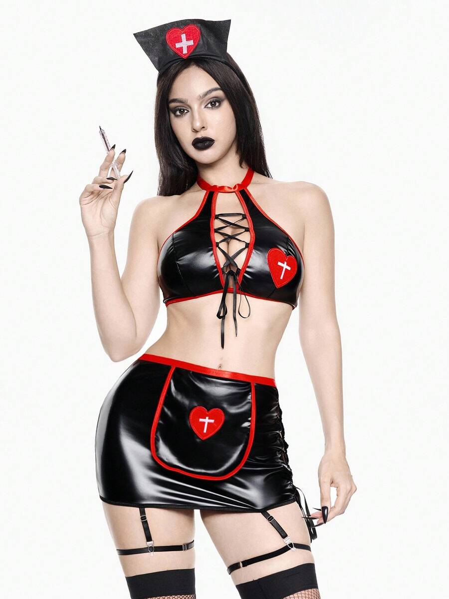 ROMWE Avant 3 pezzi Set di lingerie costume da infermiera punk scuro, sexy, per Ognissanti
