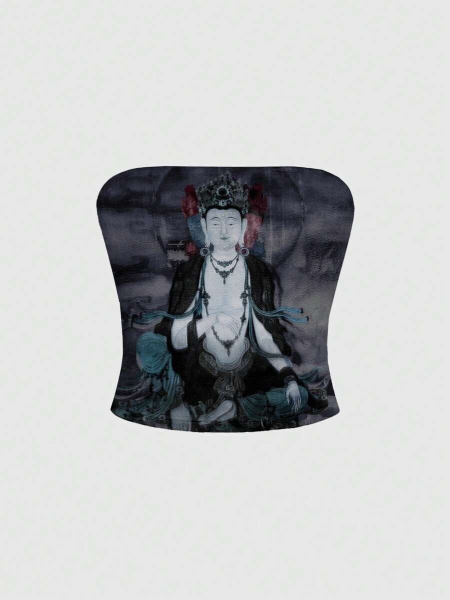 ROMWE Avant Maglietta da donna con stampa integrale nera, motivo floreale di loto buddista, stile dark e punk, adatta per festival musicali