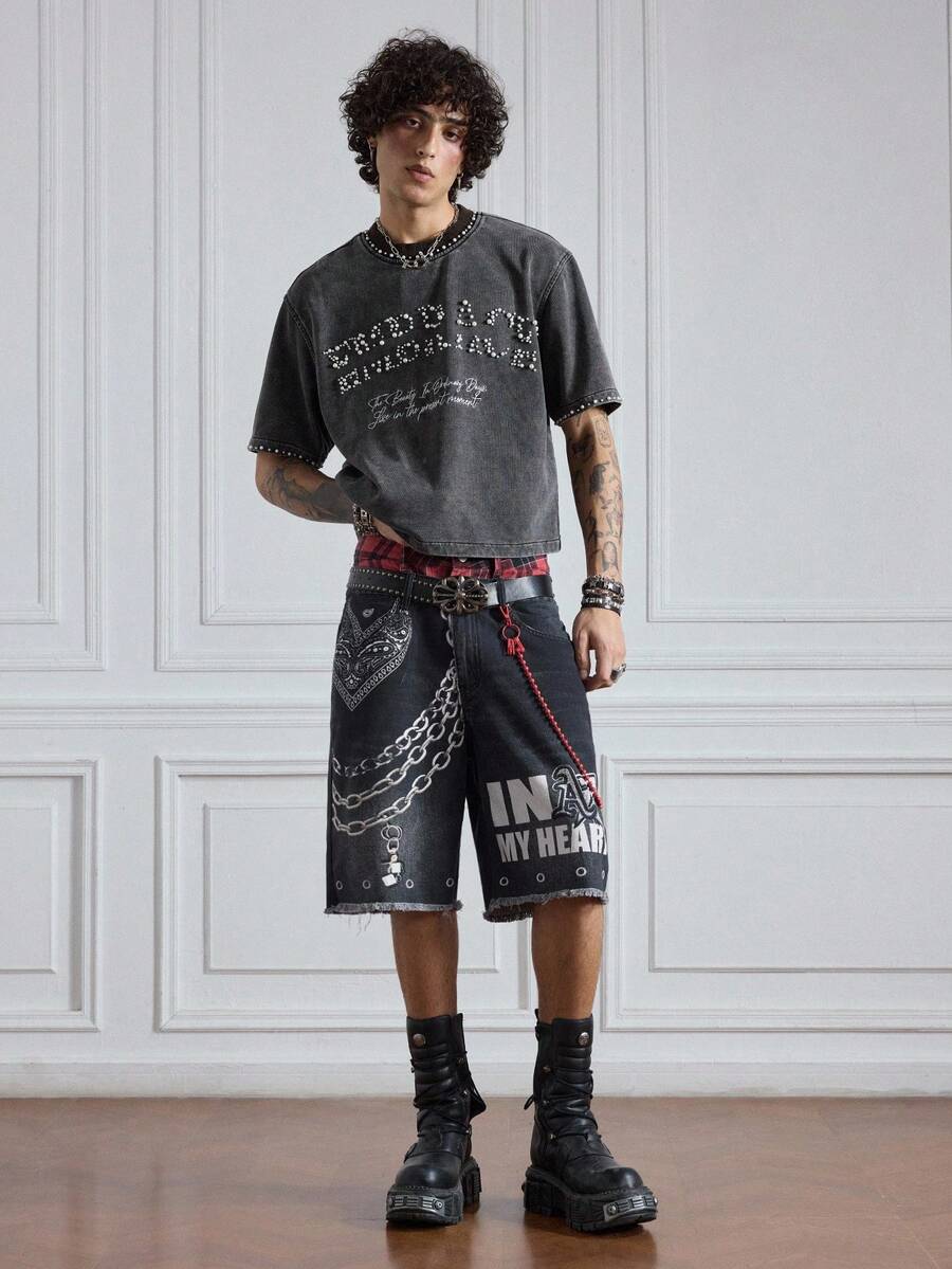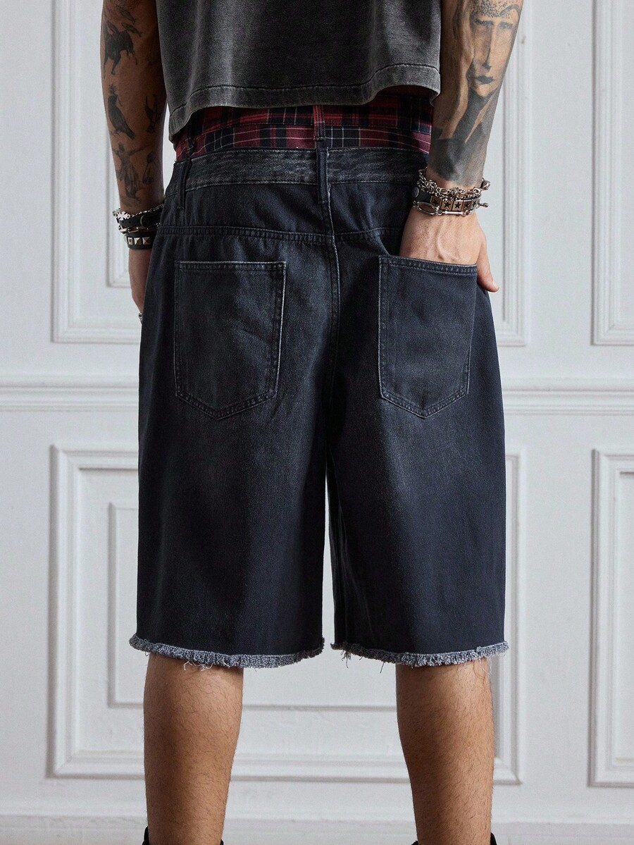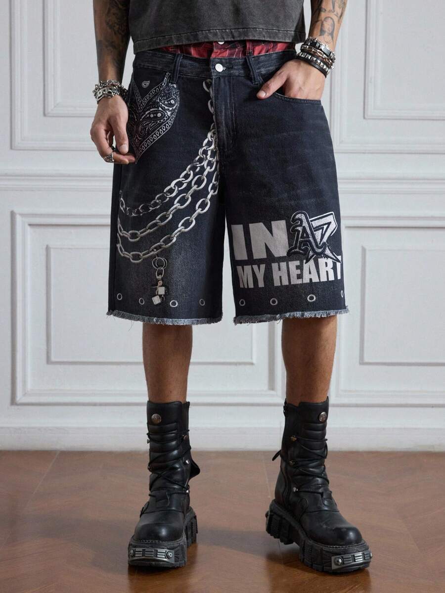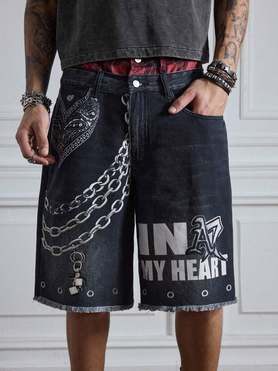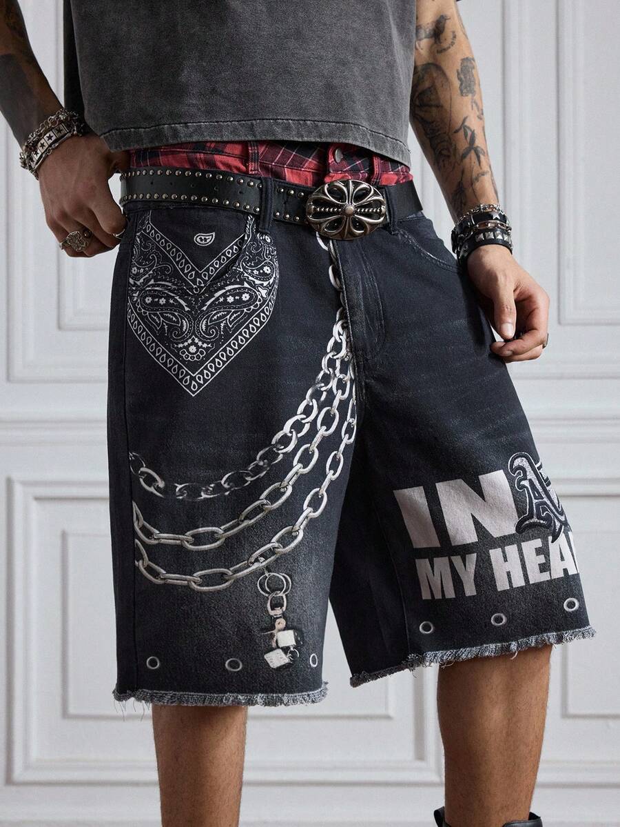 ROMWE Avant Pantaloncini di jeans casual da uomo con doppia vita e stampa retrò