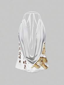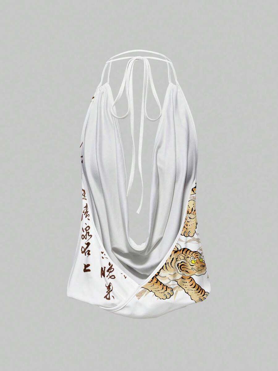 ROMWE Avant Nuovo stile cinese, top canotta da donna con tigre in calligrafia scura, sexy, con lacci e schiena scoperta, collo alto