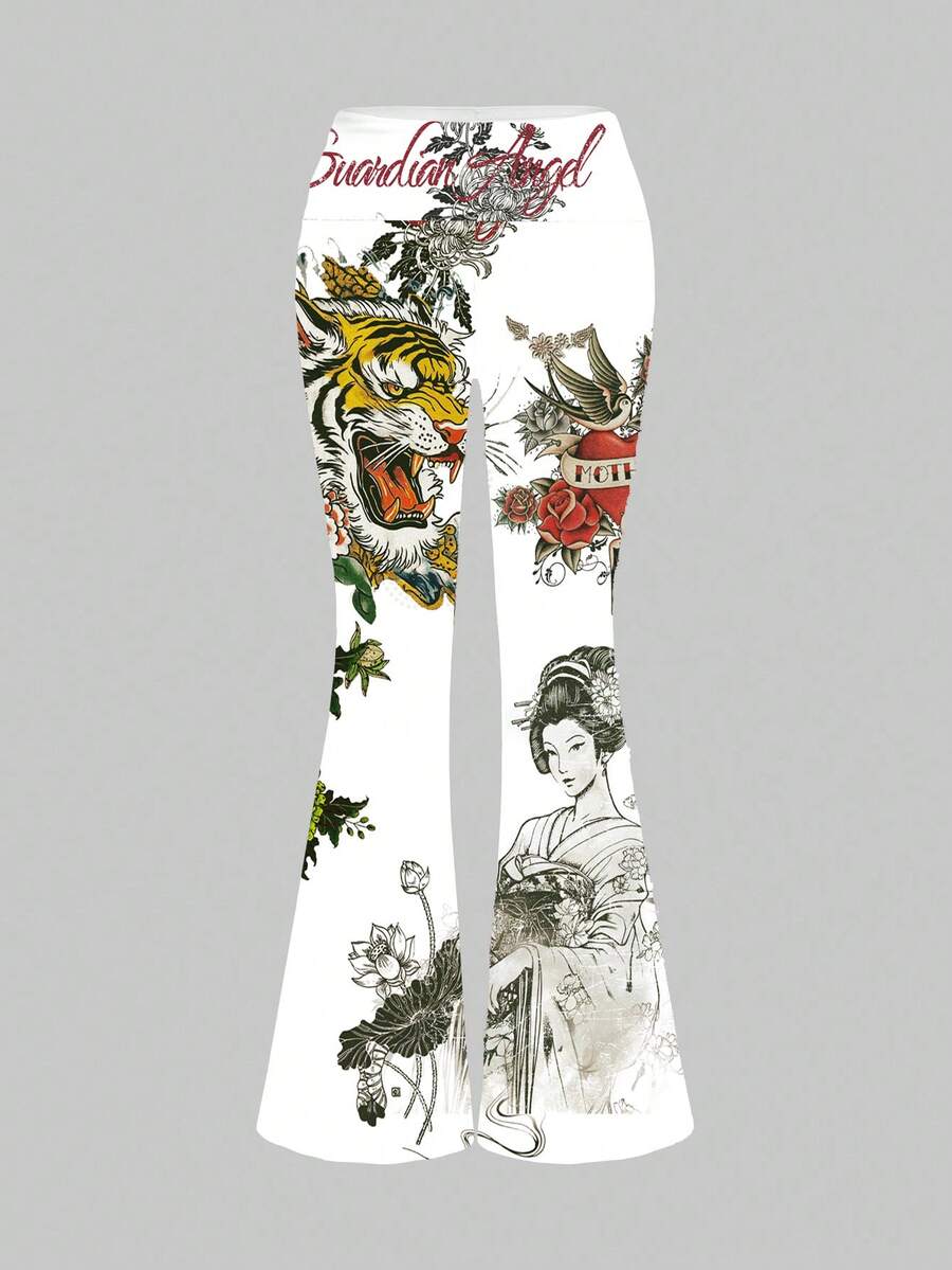 ROMWE Avant Nuovi pantaloni da donna in stile cinese con tigre, geisha, slogan, per festival musicali, sexy e dolci, con vita arricciata e gamba a campana multi-strato