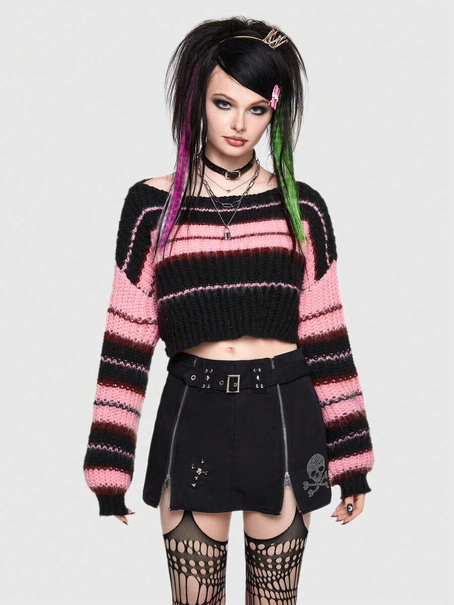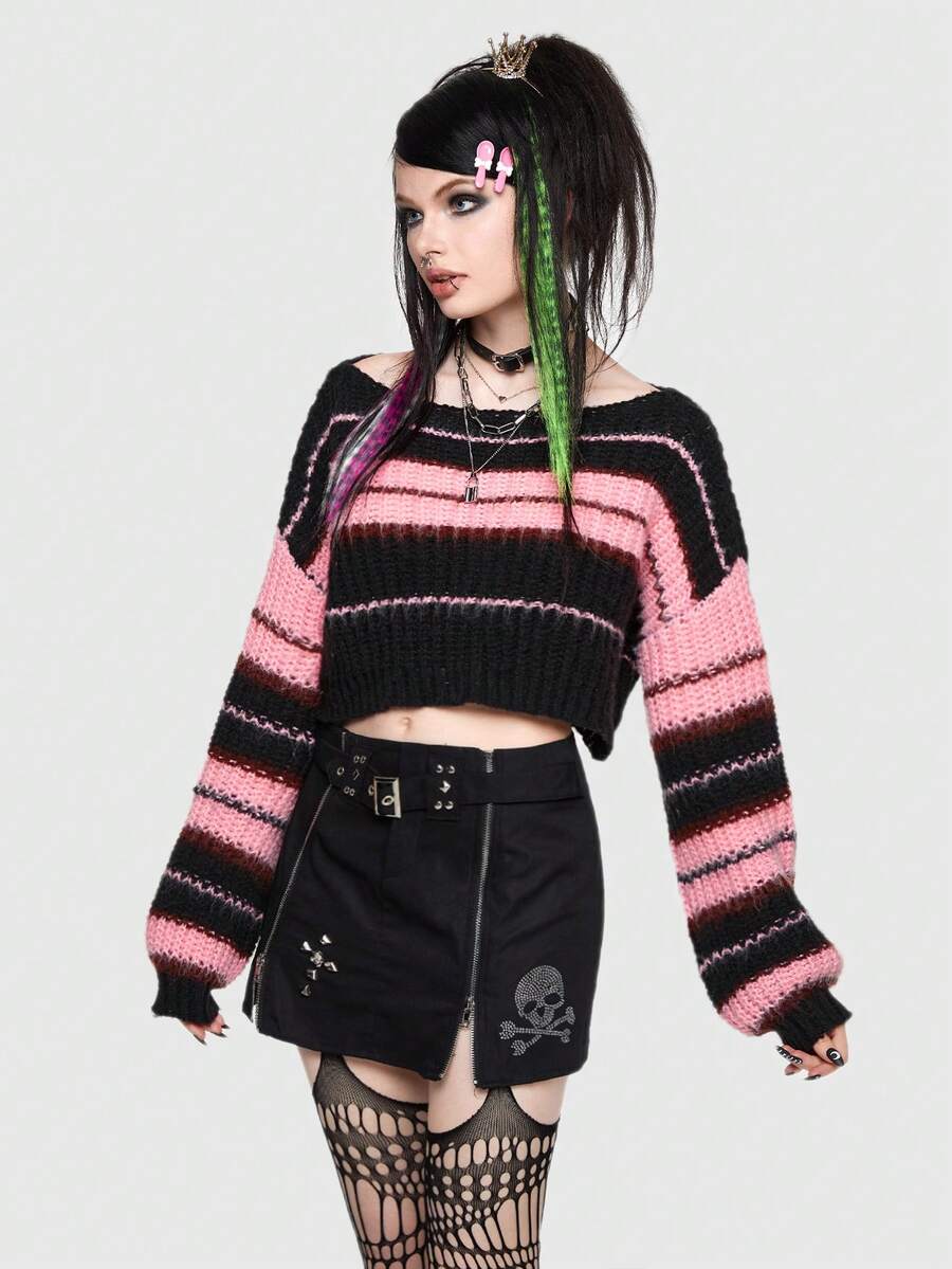 ROMWE Avant Outfit da scena Maglione corto con spalle scoperte con motivo a righe