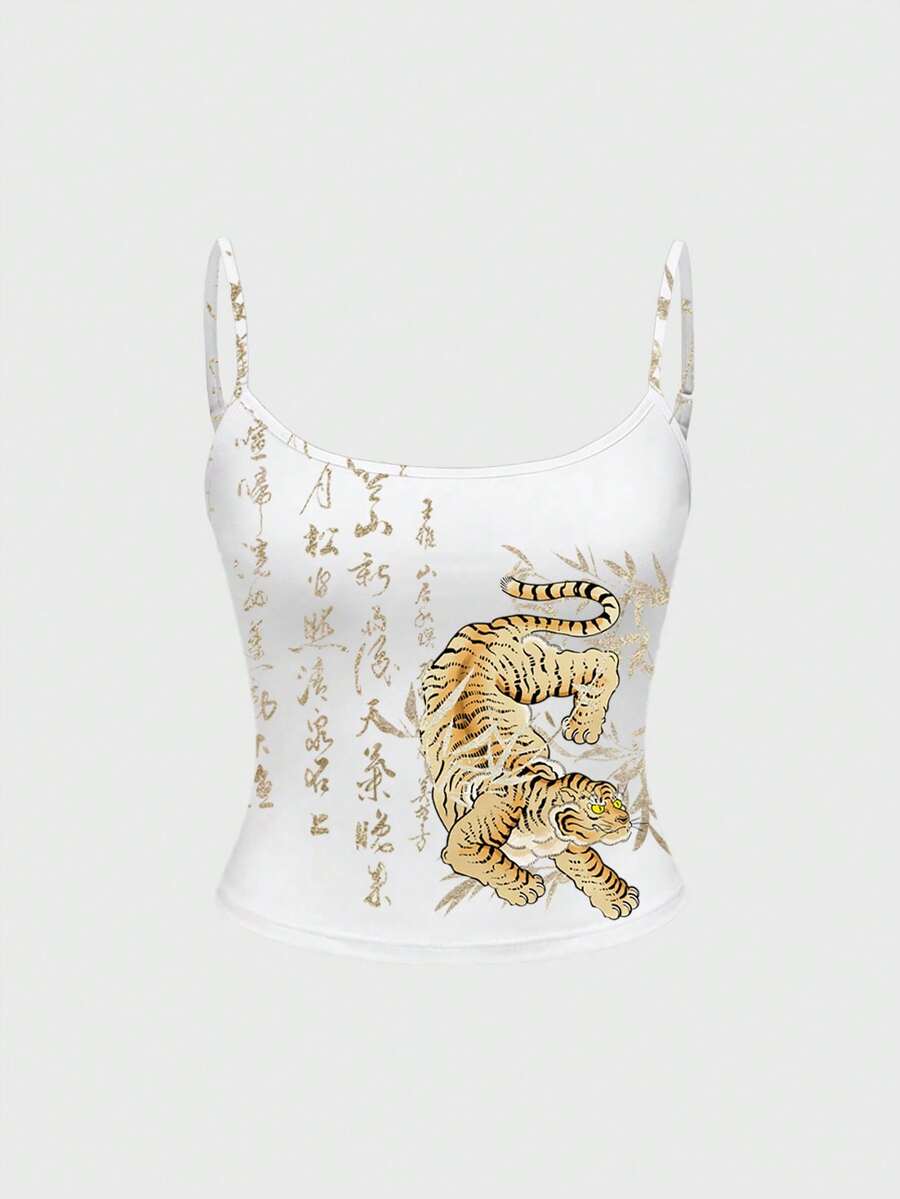 ROMWE Avant Canotta da donna in stile punk e street style con stampa di tigre, calligrafia e motivo di bambù per festival musicali