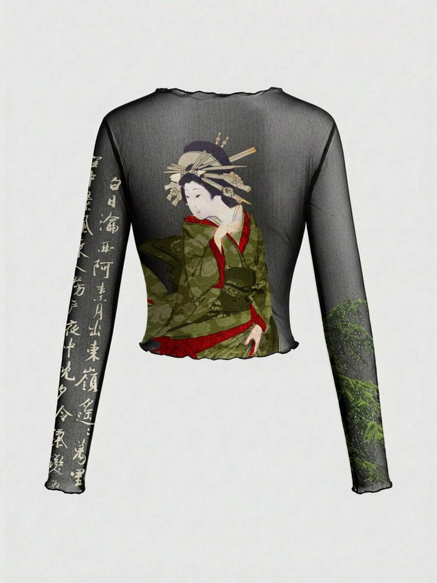 ROMWE Avant Camicetta a maniche lunghe in rete trasparente con calligrafia cinese per donna