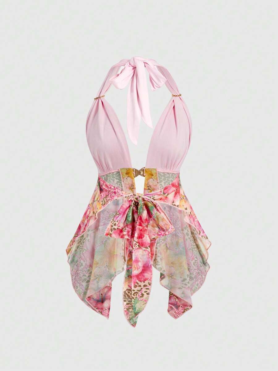 ROMWE Avant Canotta asimmetrica con stampa completa di ibisco e strass, per festival musicali estivi e vacanze, per donne