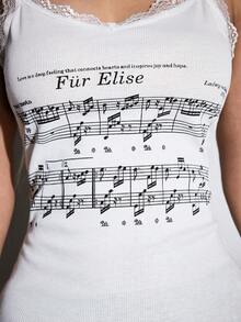 ROMWE Avant Canotta aderente da donna con stampa di note musicali e pizzo a contrasto
