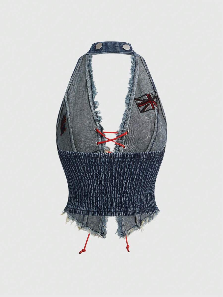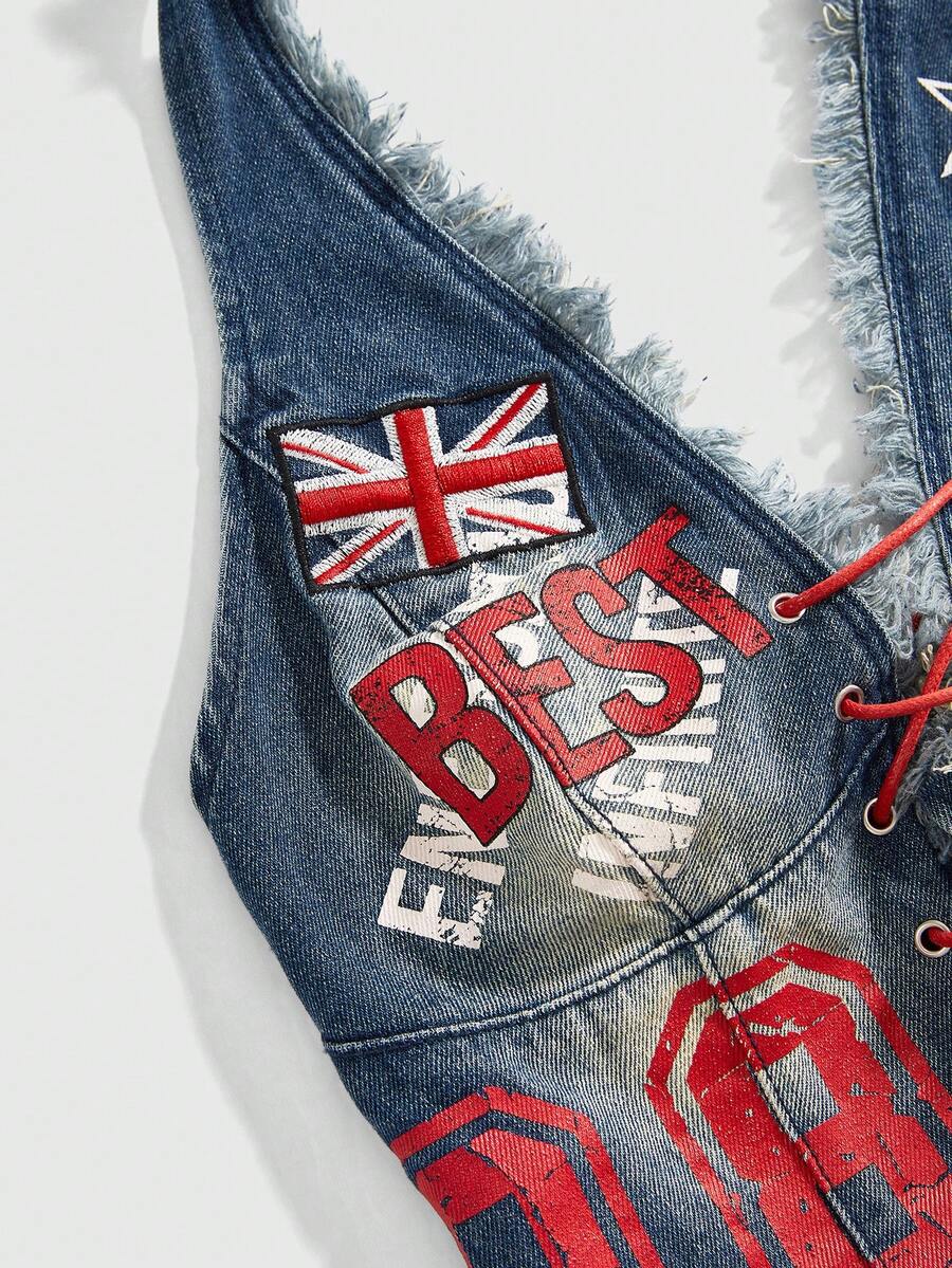 ROMWE Avant Crop top in denim senza maniche da donna, stile retrò motociclistico, con stampa di numeri, testo in inglese e bandiera britannica, adatto per il ritorno a scuola