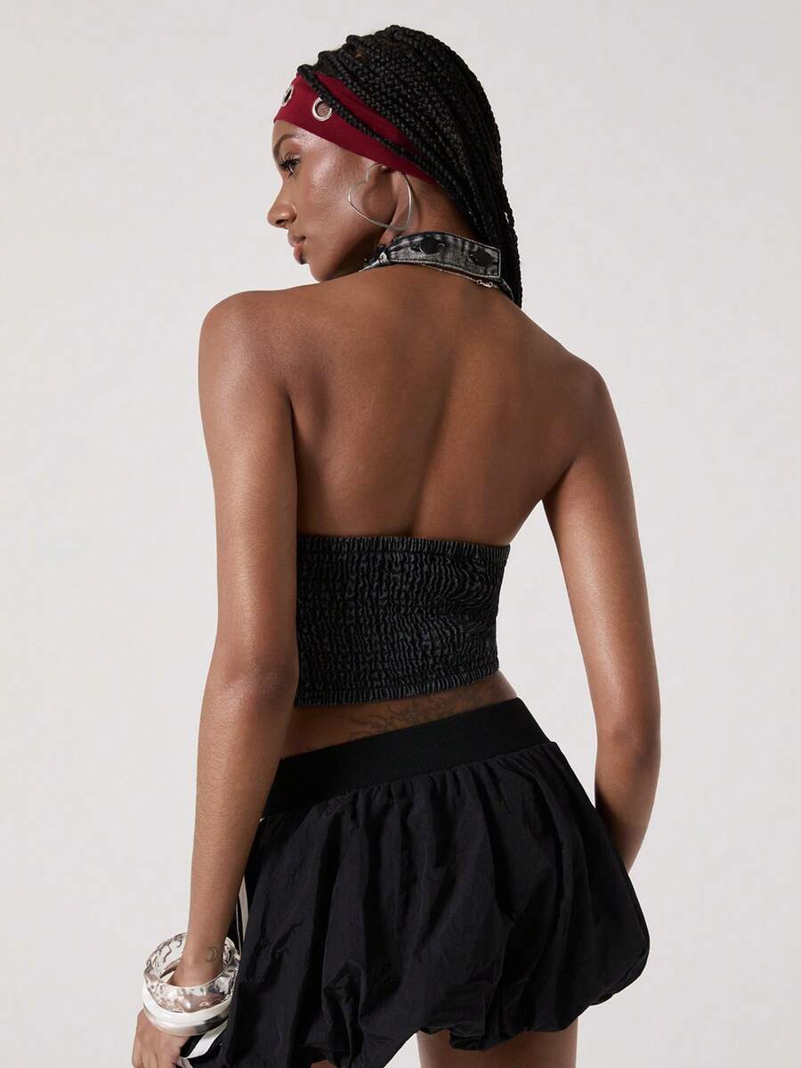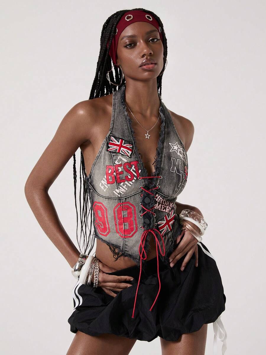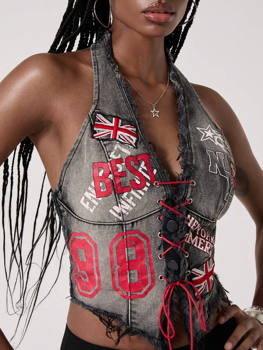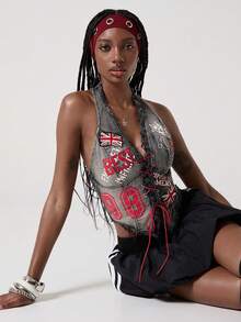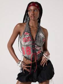 ROMWE Avant Crop top in denim senza maniche da donna, stile retrò motociclistico, con stampa di numeri, testo in inglese e bandiera britannica, adatto per il ritorno a scuola