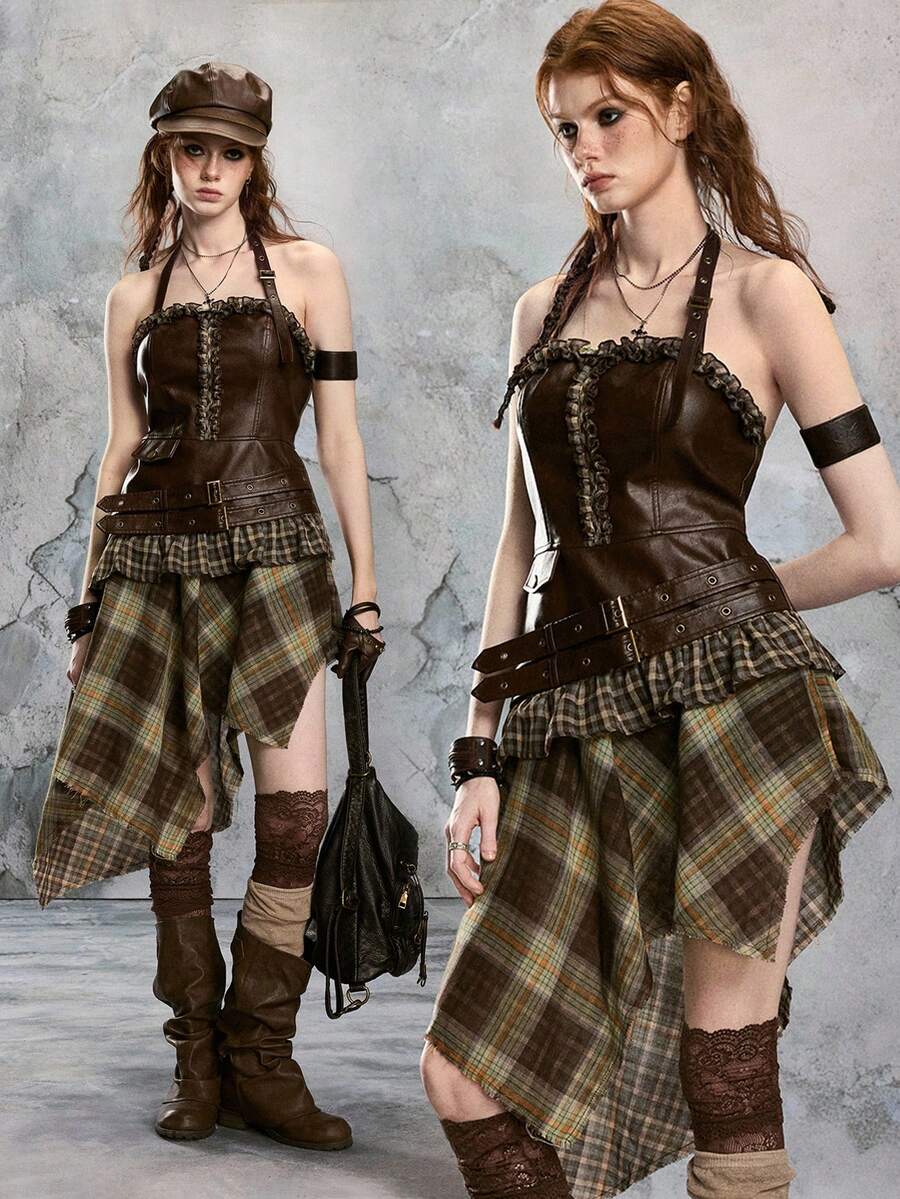 ROMWE Avant Abito da donna in stile retrò romantico punk distopico, in pelle sintetica marrone scuro con patchwork a quadri e orlo asimmetrico
