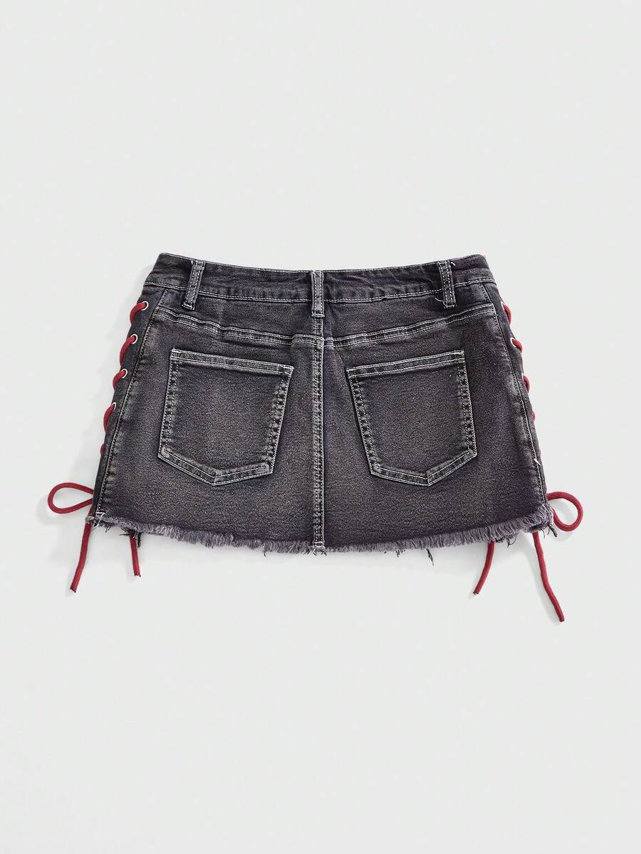 ROMWE Avant Gonna mini aderente in denim con vita bassa, stile sportivo retrò Y2K, con logo grafico ricamato e coulisse