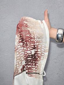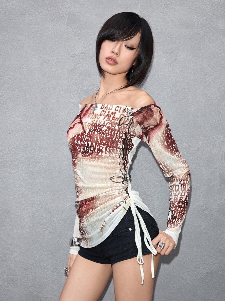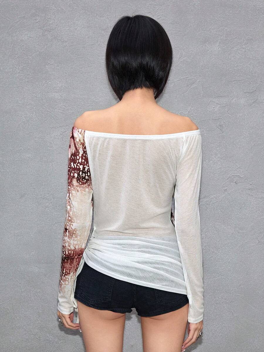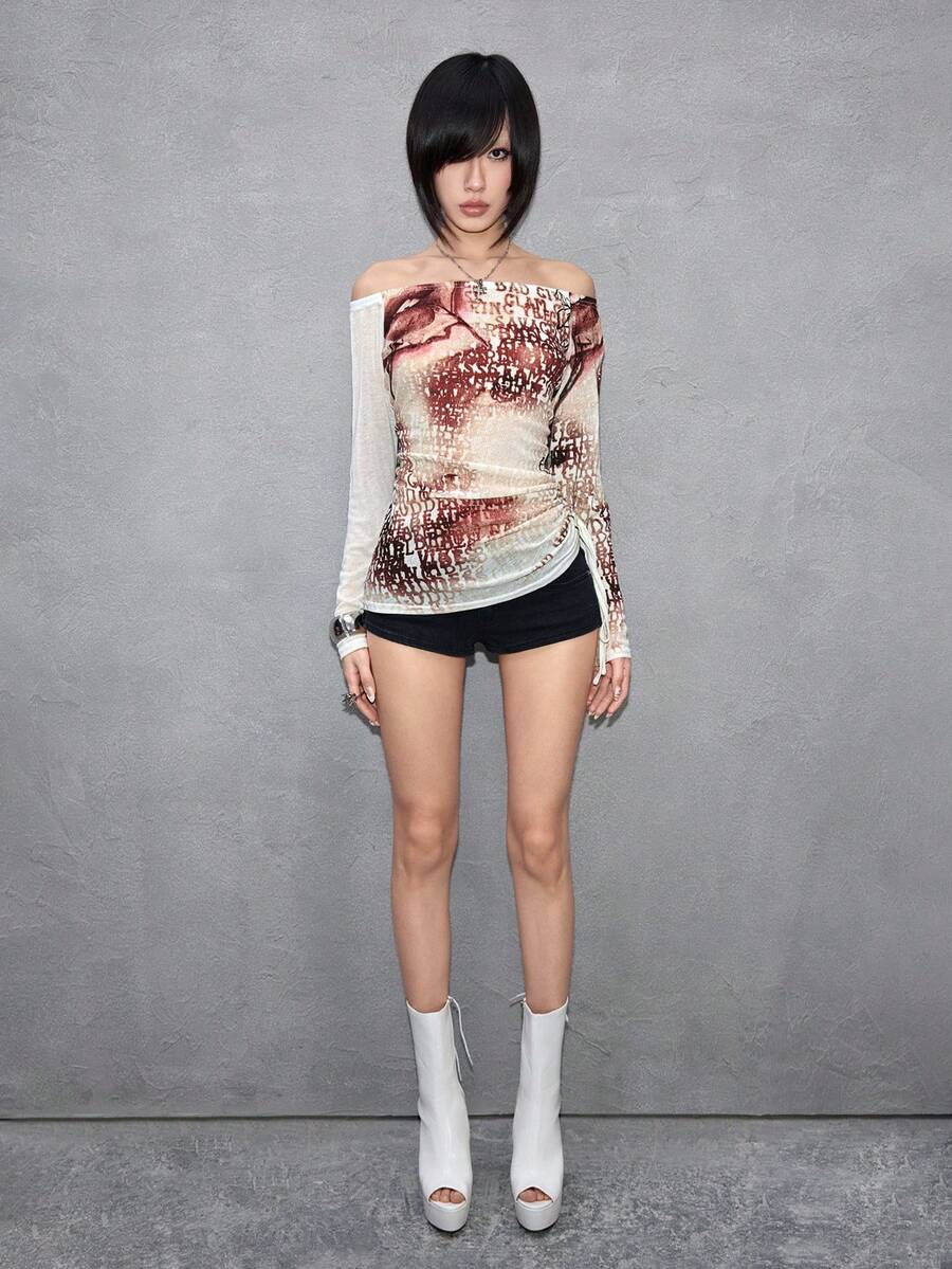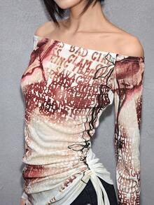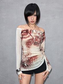 ROMWE Avant Maglietta trasparente da donna con stampa sexy di ritratto e logo di lettera, scollo a spalle scoperte, stile Y2K