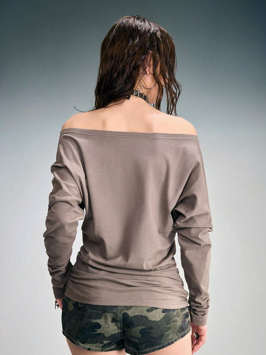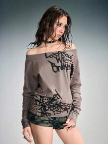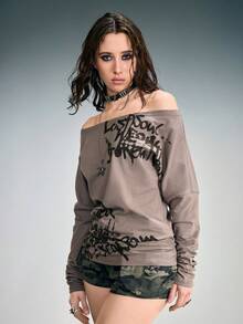 ROMWE Avant Maglietta a maniche lunghe con scollo a spalla e stampa slogan sexy in stile Y2K per donne