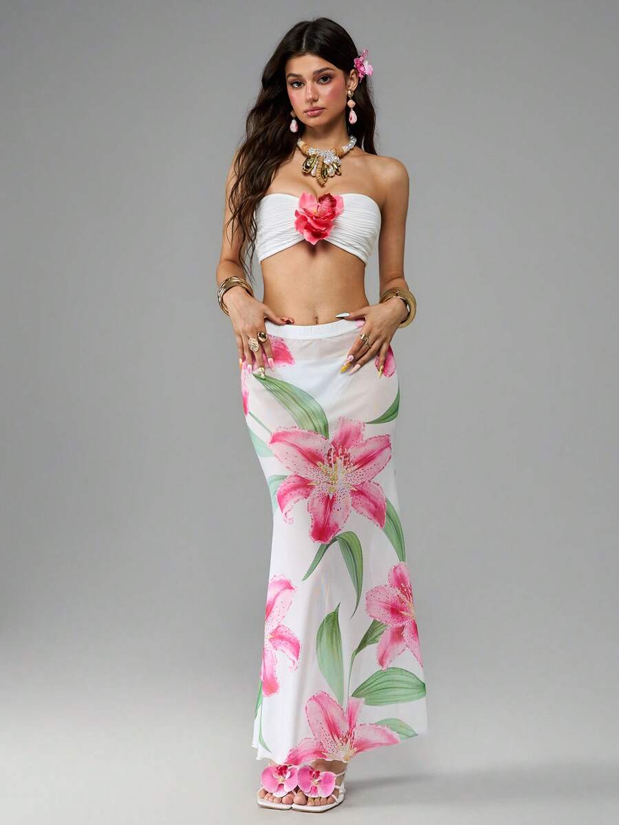ROMWE Avant Camicetta per vacanze estive da donna, in stile Y2K, con stampa di fiori di giglio bianchi e rosa