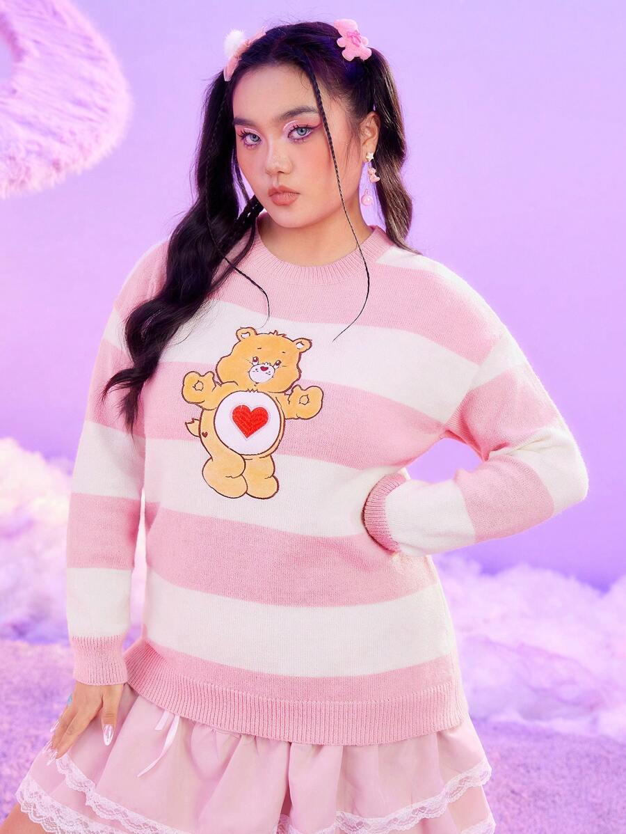 ROMWE X Care Bears Maglione A Righe Color Block Con Cerniera A Collo Alto, Ricamato Con Orso Per Taglie Forti