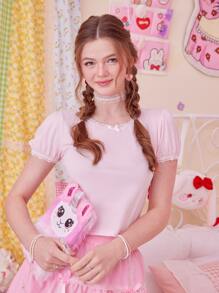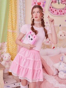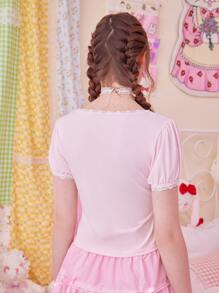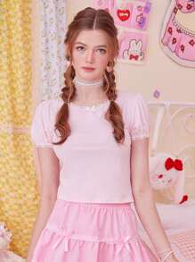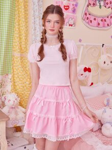 Kawaii Maglietta orlo di pizzo con manica a sbuffo