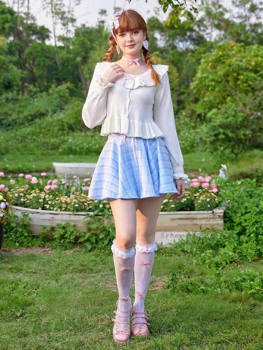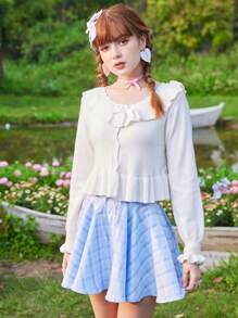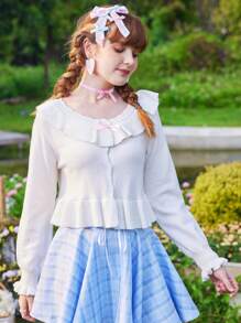 Kawaii Cardigan da donna Fiocco Orlo arricciato Bottone frontale Colore unico Casual