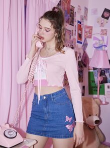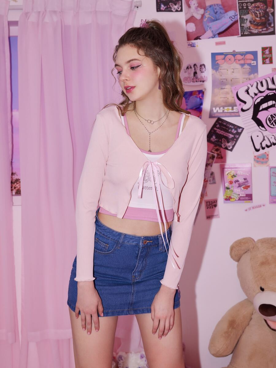 Top corto monocolore nodo frontale orlo lattuga senza Cami