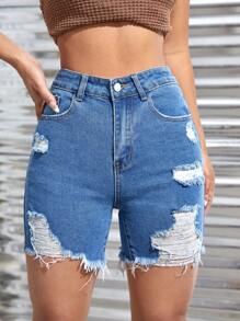 Pantaloncini da ciclismo orlo grezzo vita alta con strappati denim