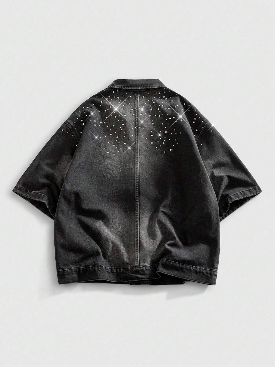 Top in denim casual e ampio con applicazioni di strass sulle maniche corte