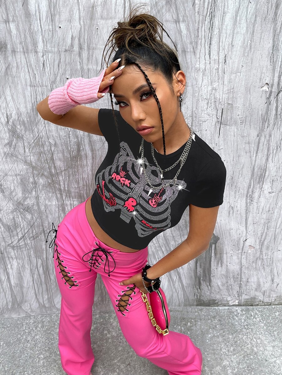 Maglietta corta con strass con modello scheletro con grafica lettera