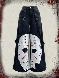 Friday the 13th X ROMWE Jeans larghi con vita alta, grafica oversize ricamata, con cintura, per donna