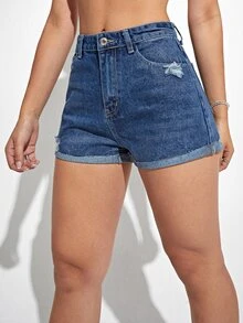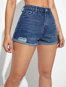 Shorts in denim con ricamo con orlo arrotolato strappati