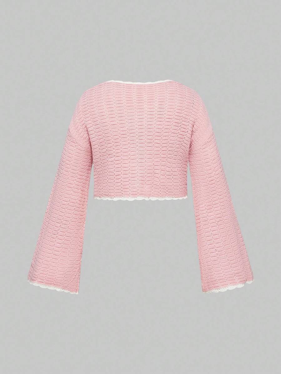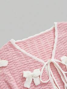 Kawaii Cardigan in maglia rosa con maniche a sbuffo, fiocco e orlo arricciato, taglia comoda, elegante e adorabile, adatto per l'autunno/inverno