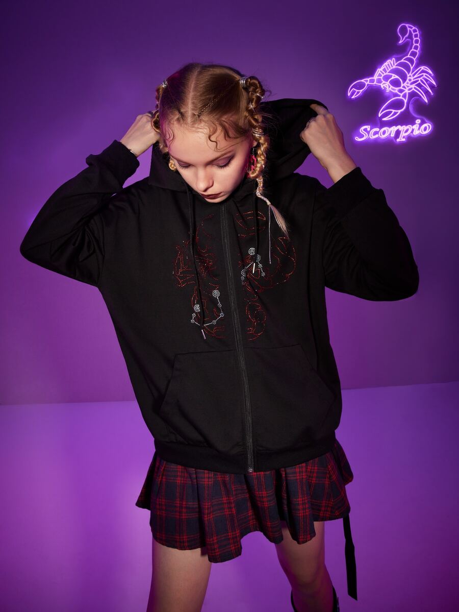 Felpa con cappuccio scorpione con strass con zip tasca con coulisse