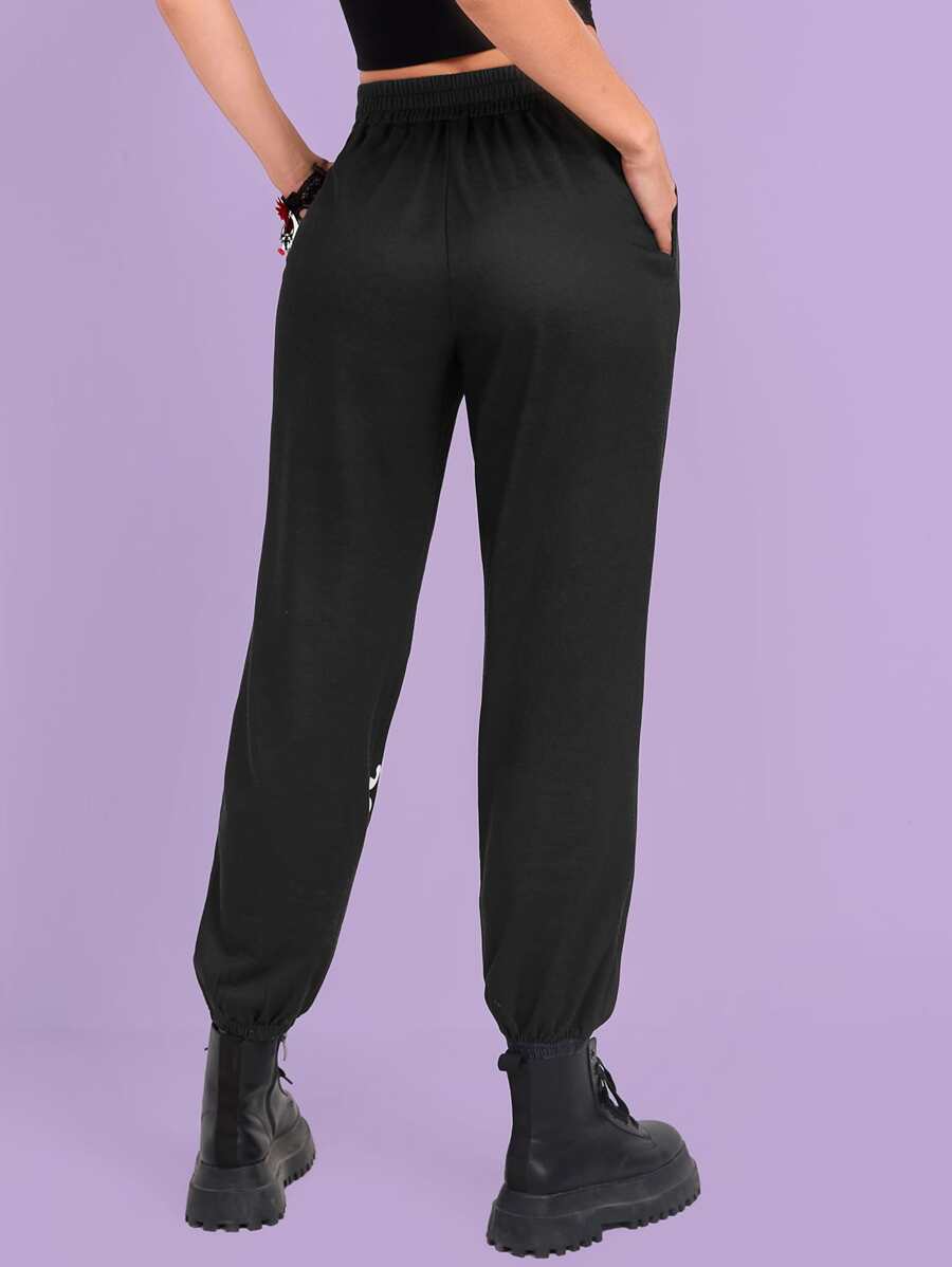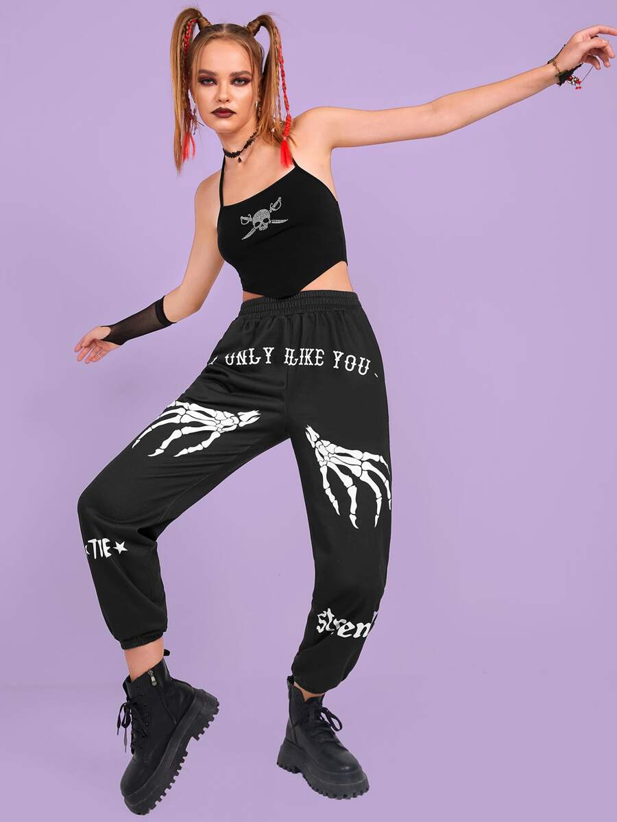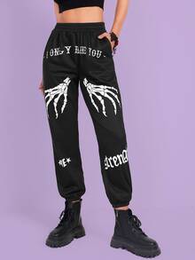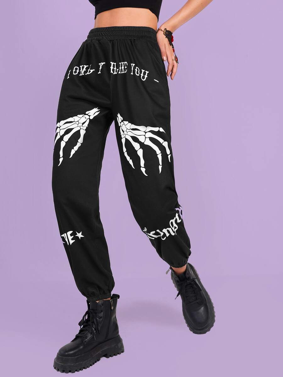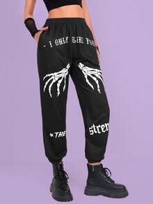 Pantaloni sportivi con vita arricciata con stampa di slogan e dito di scheletro
