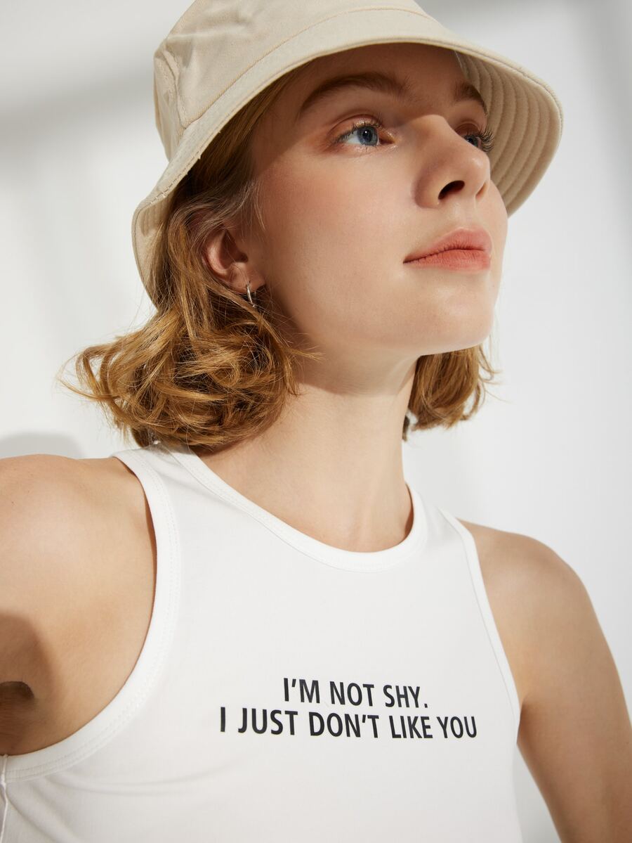 Top corto con grafica di slogan NON SONO TIMIDA, MI PIACI SOLO