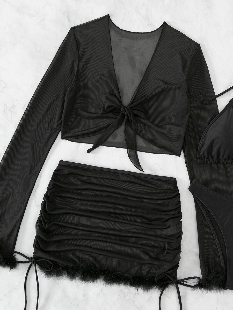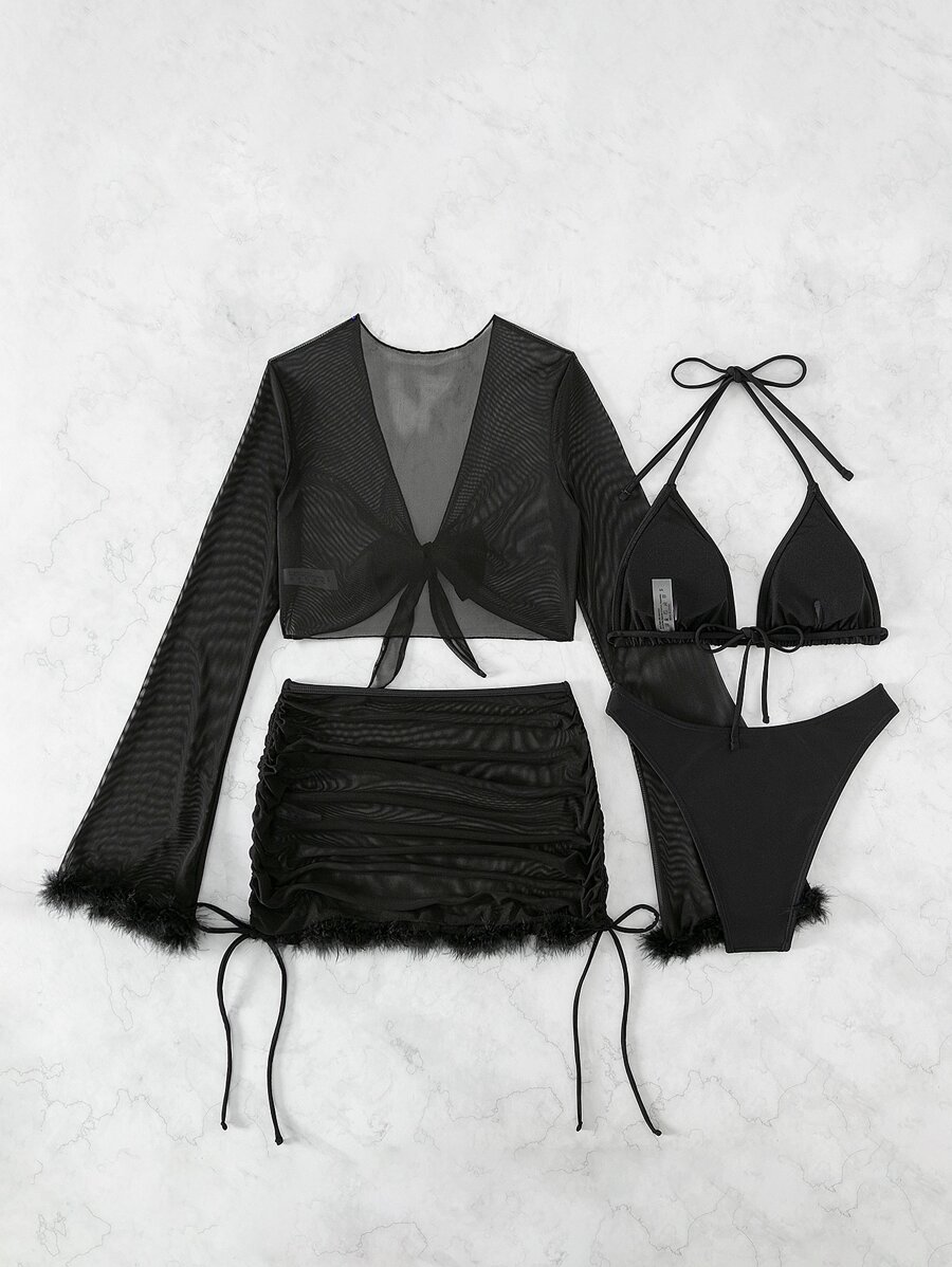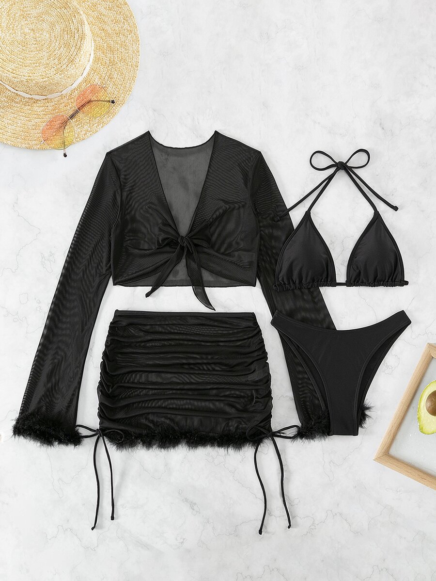 Set bikini monocolore Reggiseno halter triangolo & cheeky Bottom & Cover up Top & bordo sfocato Gonne 4 pezzi Costume da bagno