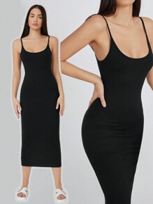 Vestito Solido Da Cena Informale Con Spaghetti E Fascia Attillato Al Corpo