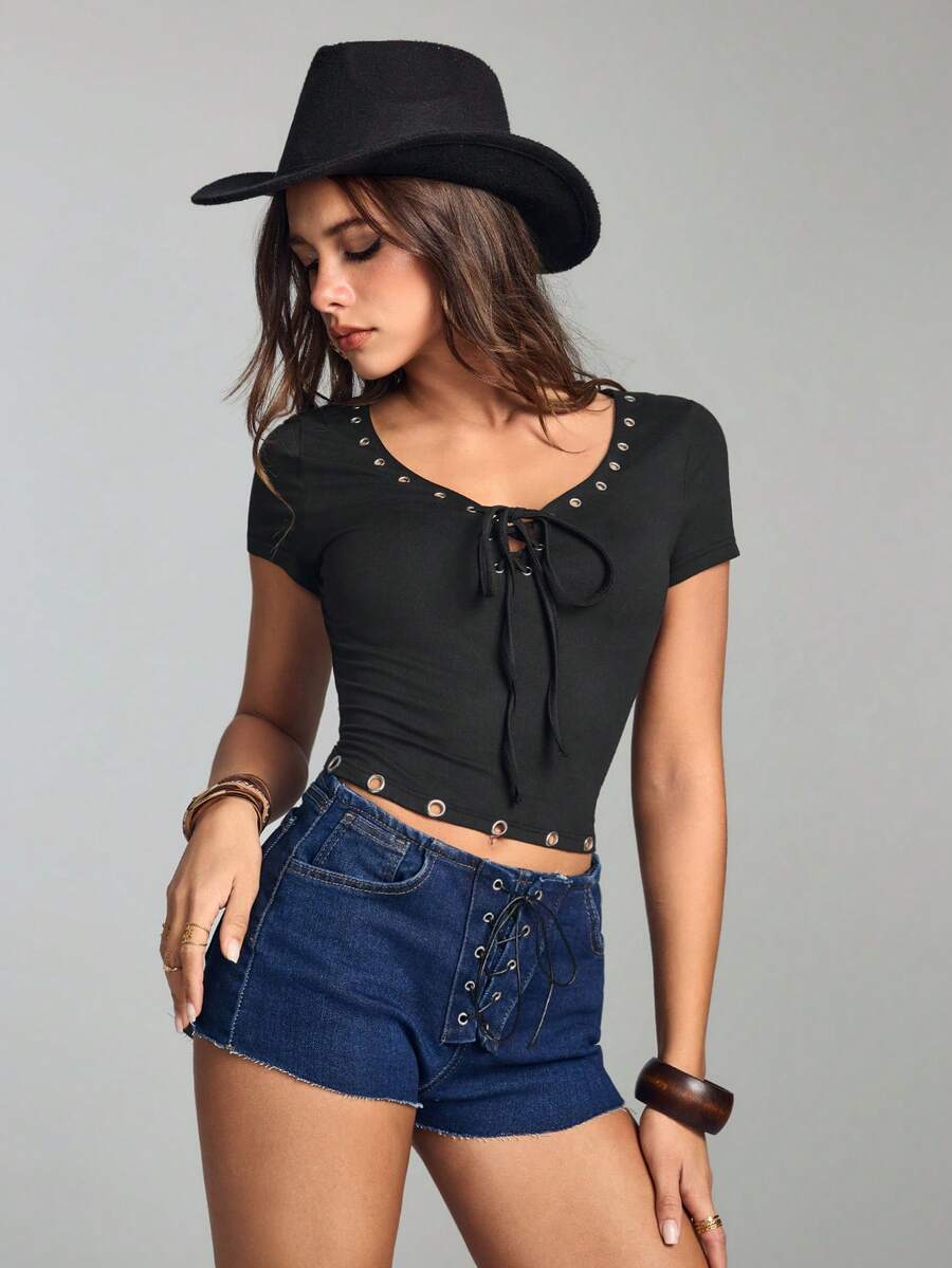 Maglietta a maniche corte con fiocco e taglio sulla vita, stile grunge punk, per donna, adatta alla primavera/estate, con occhielli in metallo e laccio frontale
