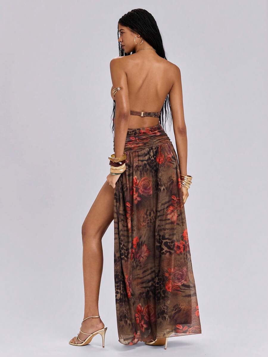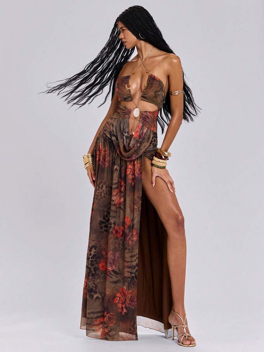 Abito lungo con spacco alto, stampa floreale, catena e motivo conchiglia, in stile Y2K e sexy, adatto per la spiaggia