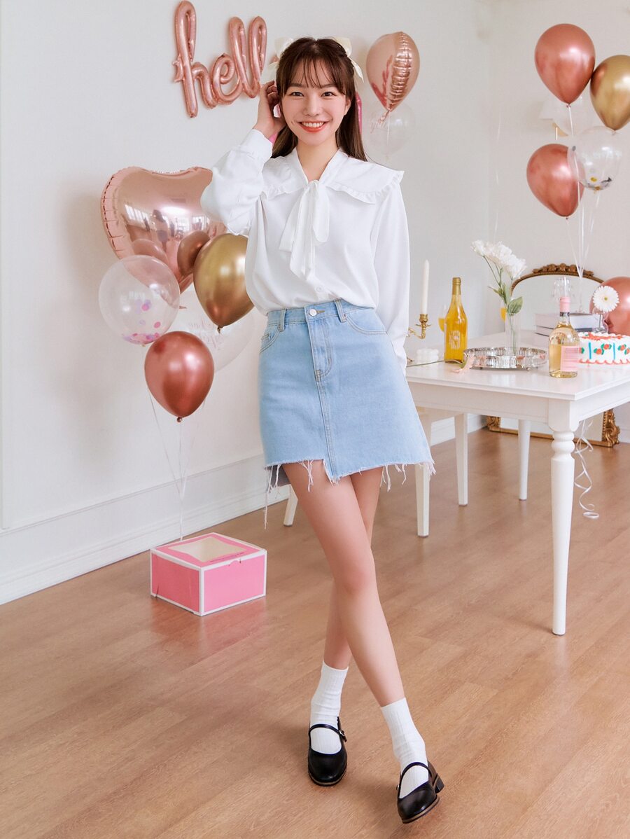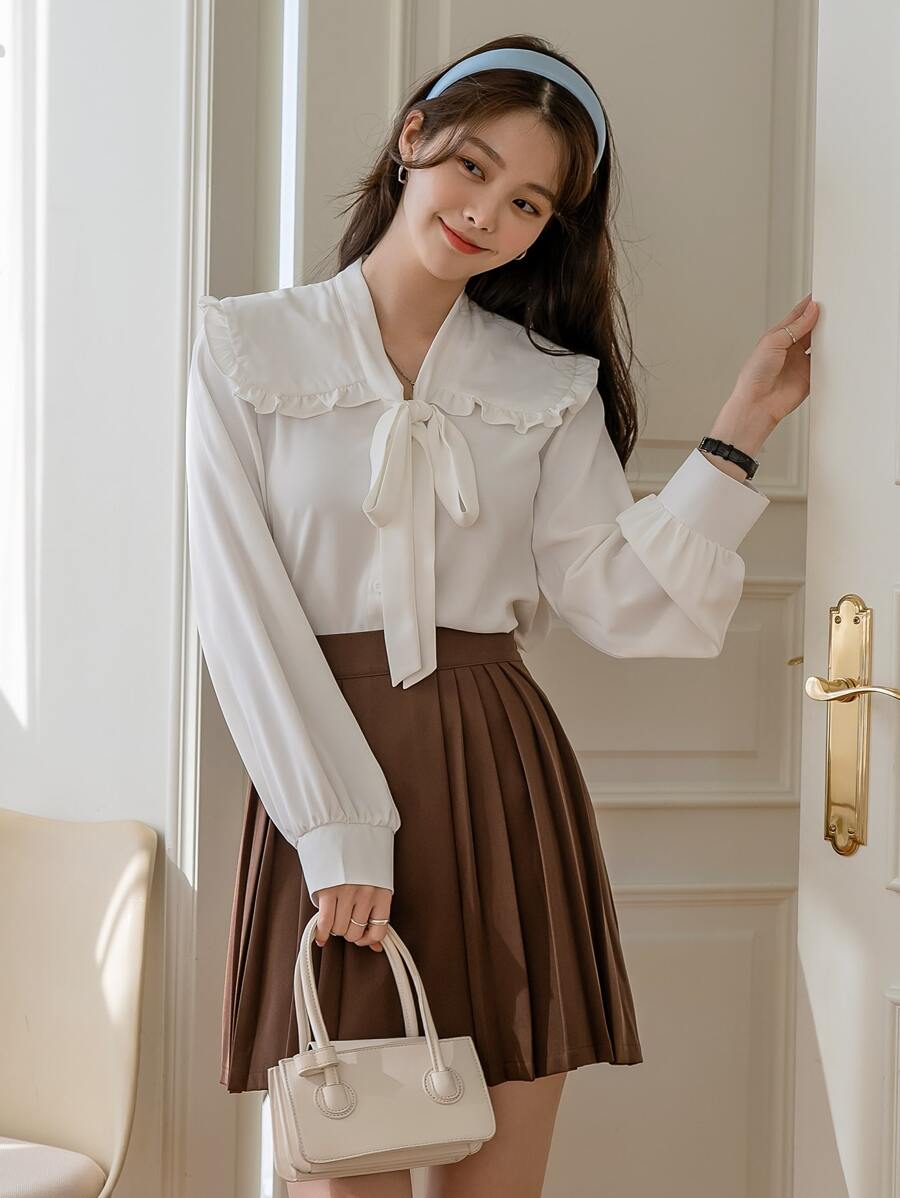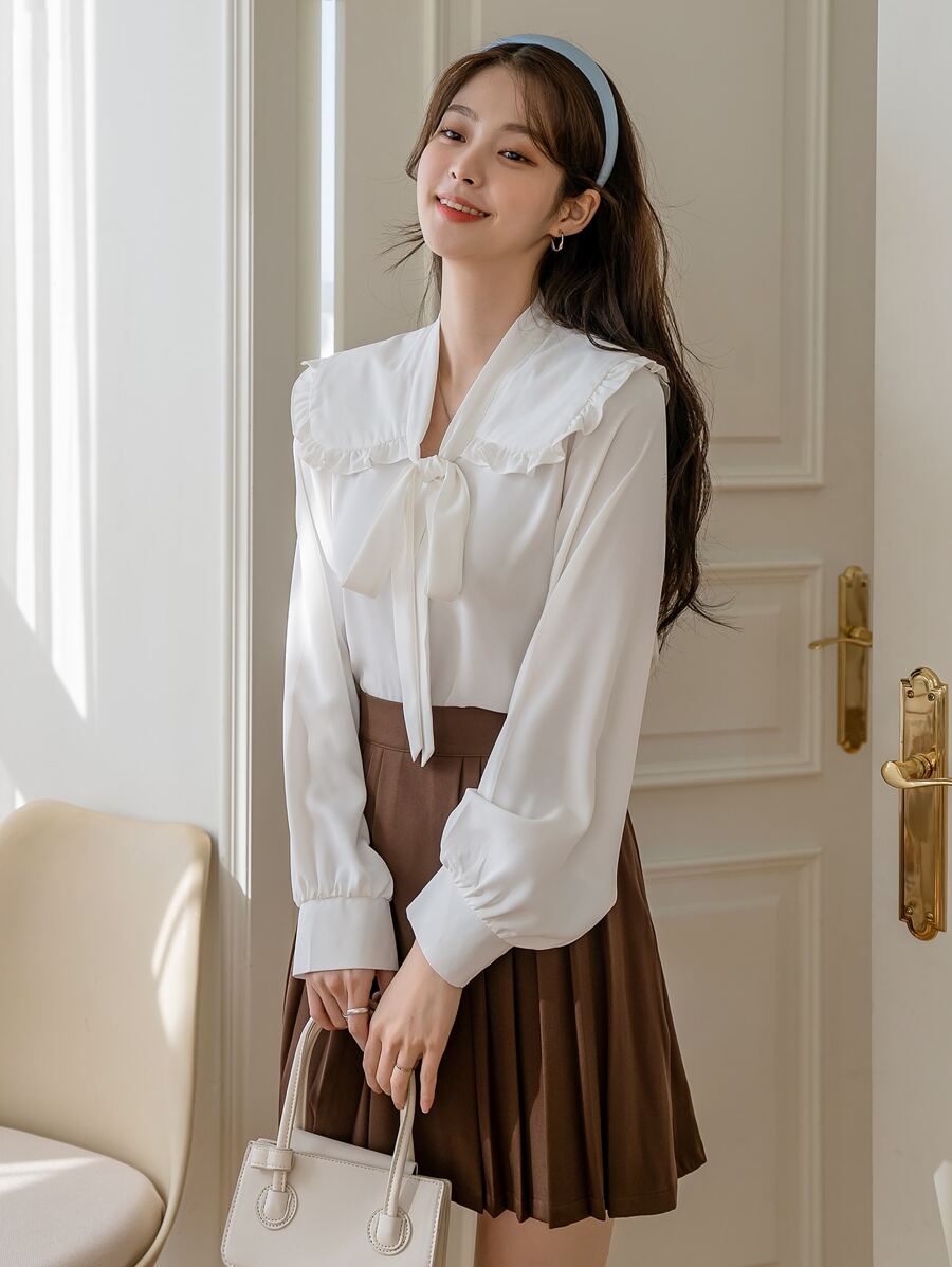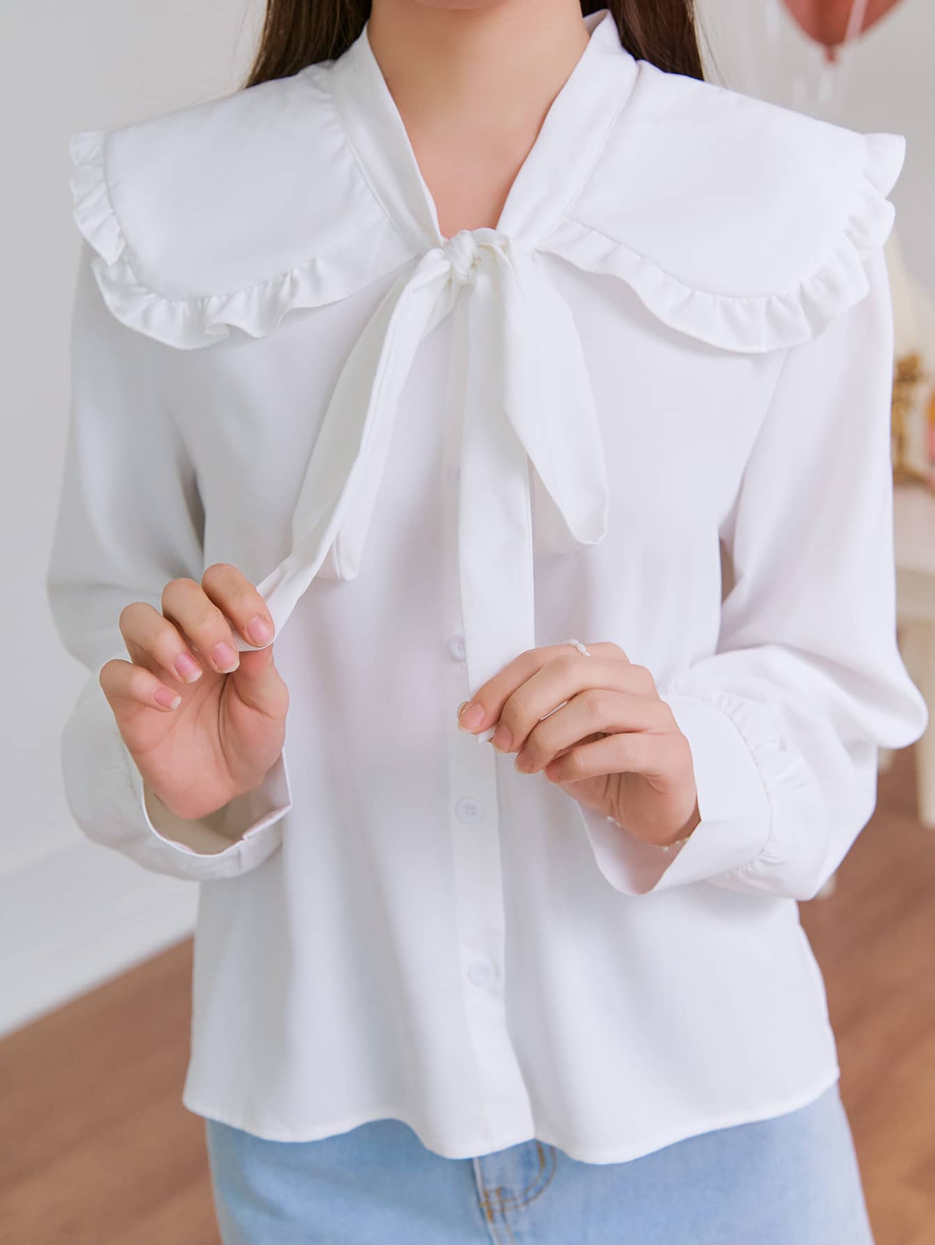 Blusa con colletto a balze, nodo frontale, maniche lunghe, abbigliamento autunnale