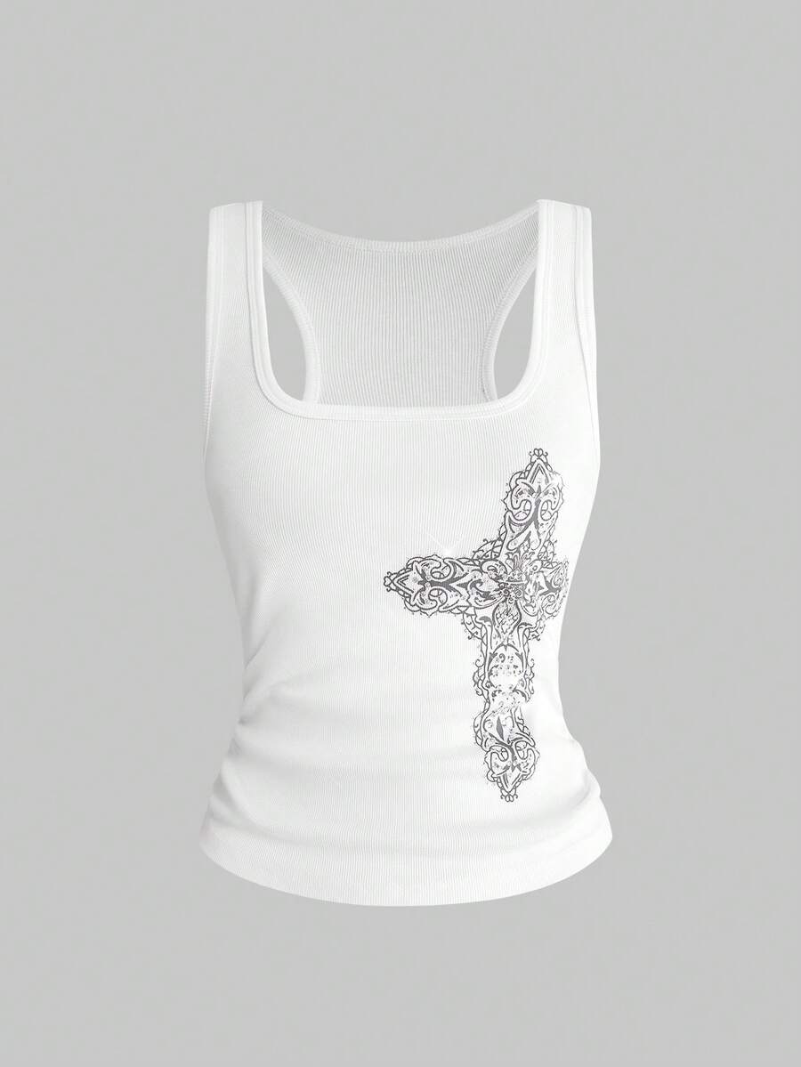 Street Life Canotta aderente lavata con stampa a croce grunge e strass