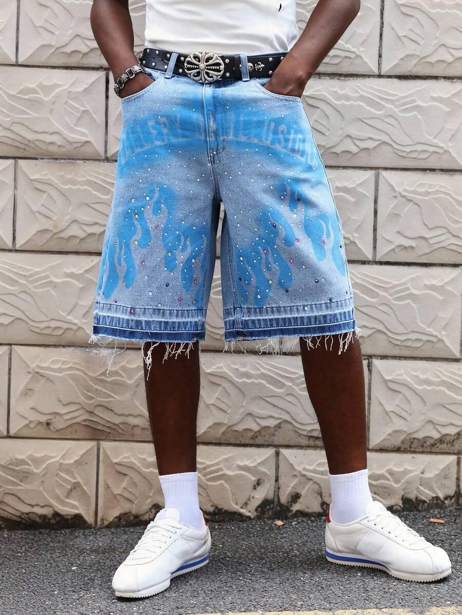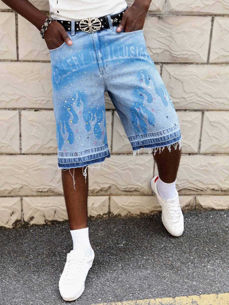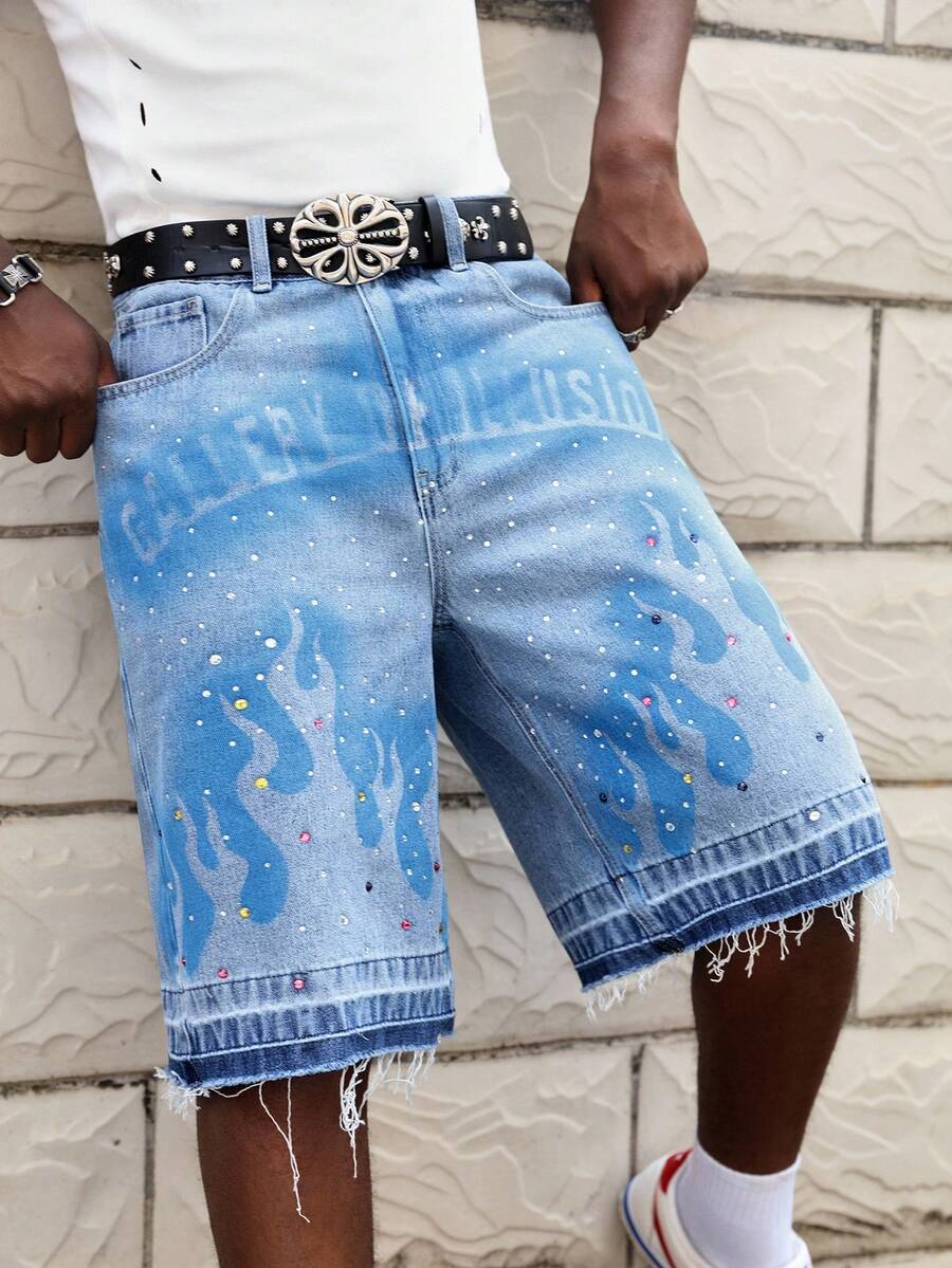 Street Life Pantaloncini di jeans da uomo con decorazione di cristalli, stampati, adatti per primavera/estate