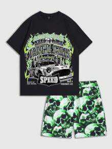 Street Life Set da 2 pezzi composto da Maglietta a maniche corte e pantaloncini stampati da uomo, adatto per l'utilizzo quotidiano in primavera ed estate, anche per la scuola