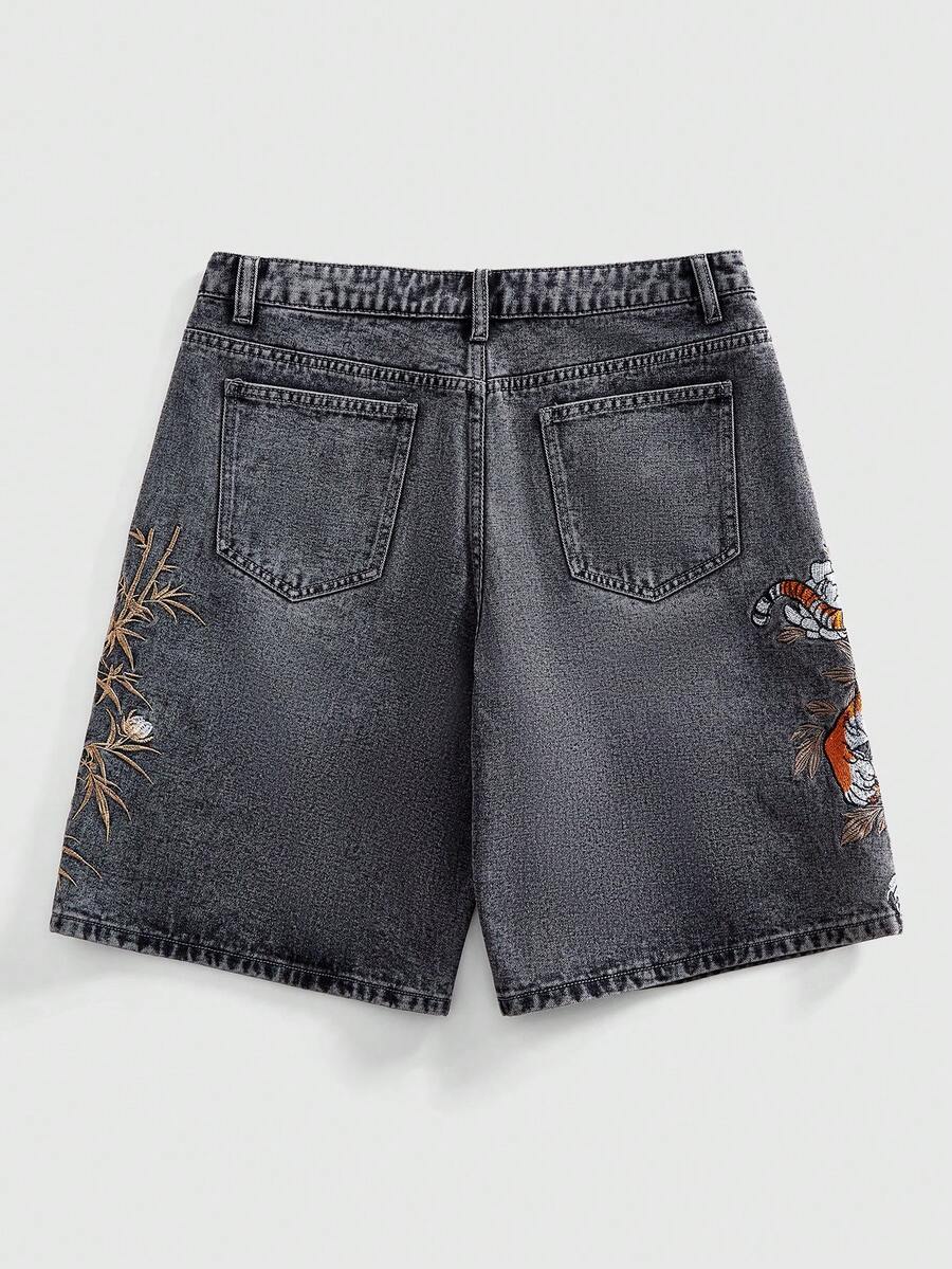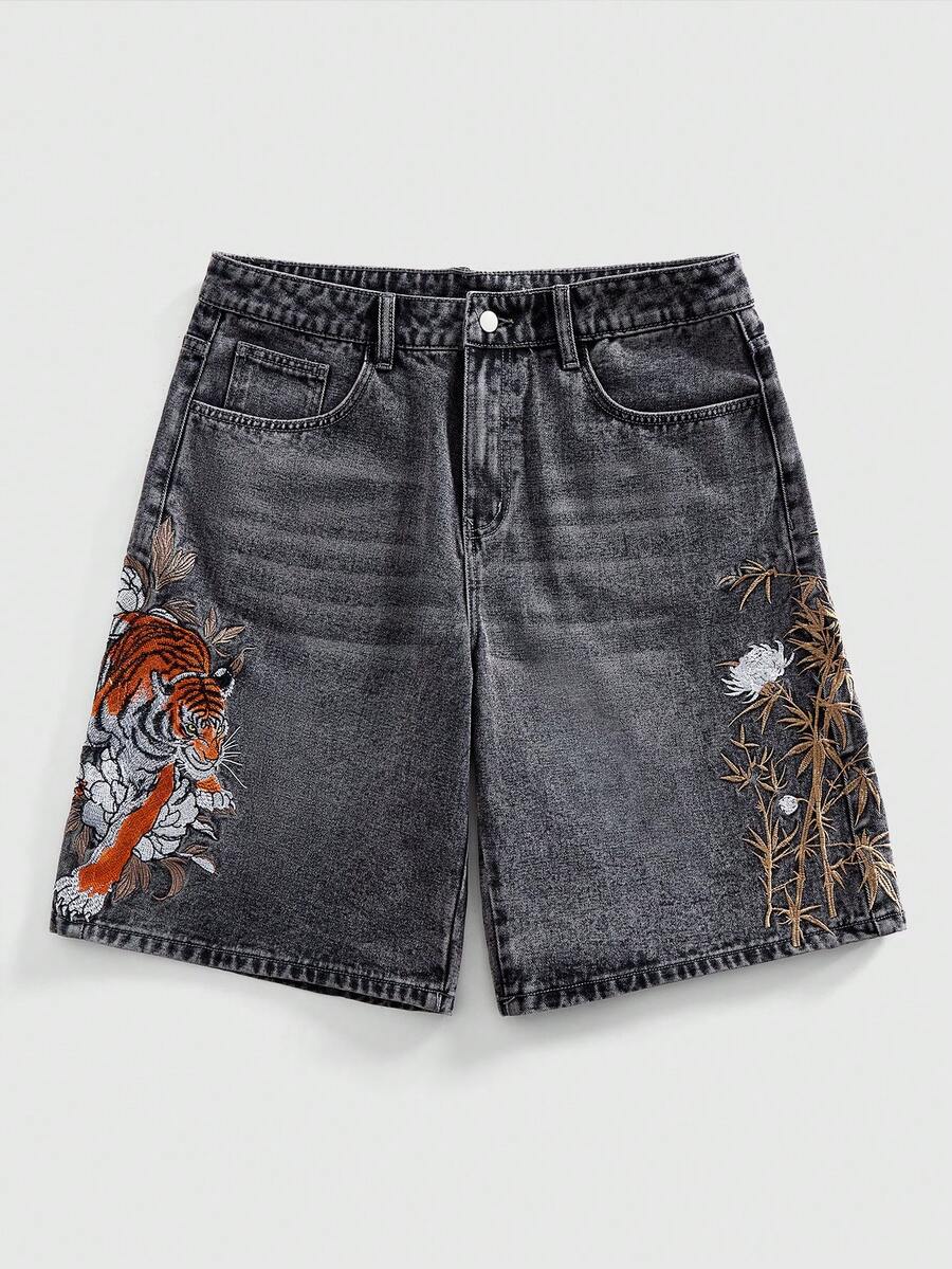 Street Life Pantaloncini di jeans casual da uomo con tasche oblique e ricami di animali e piante