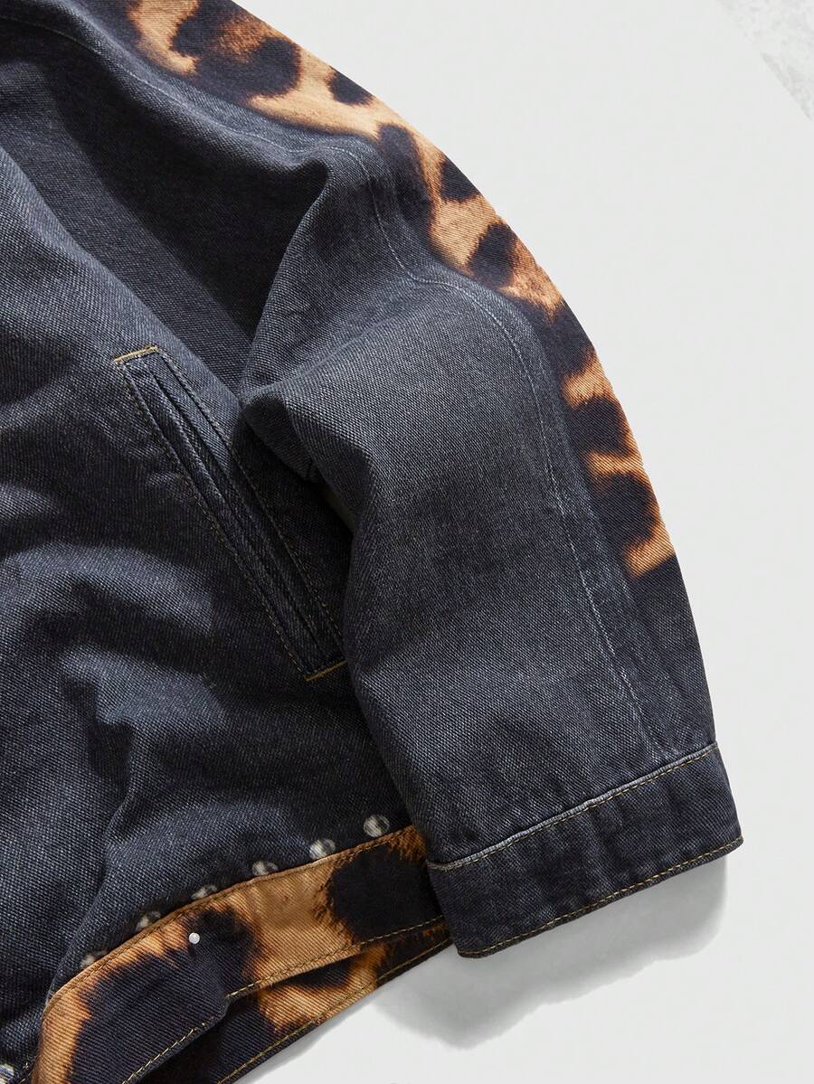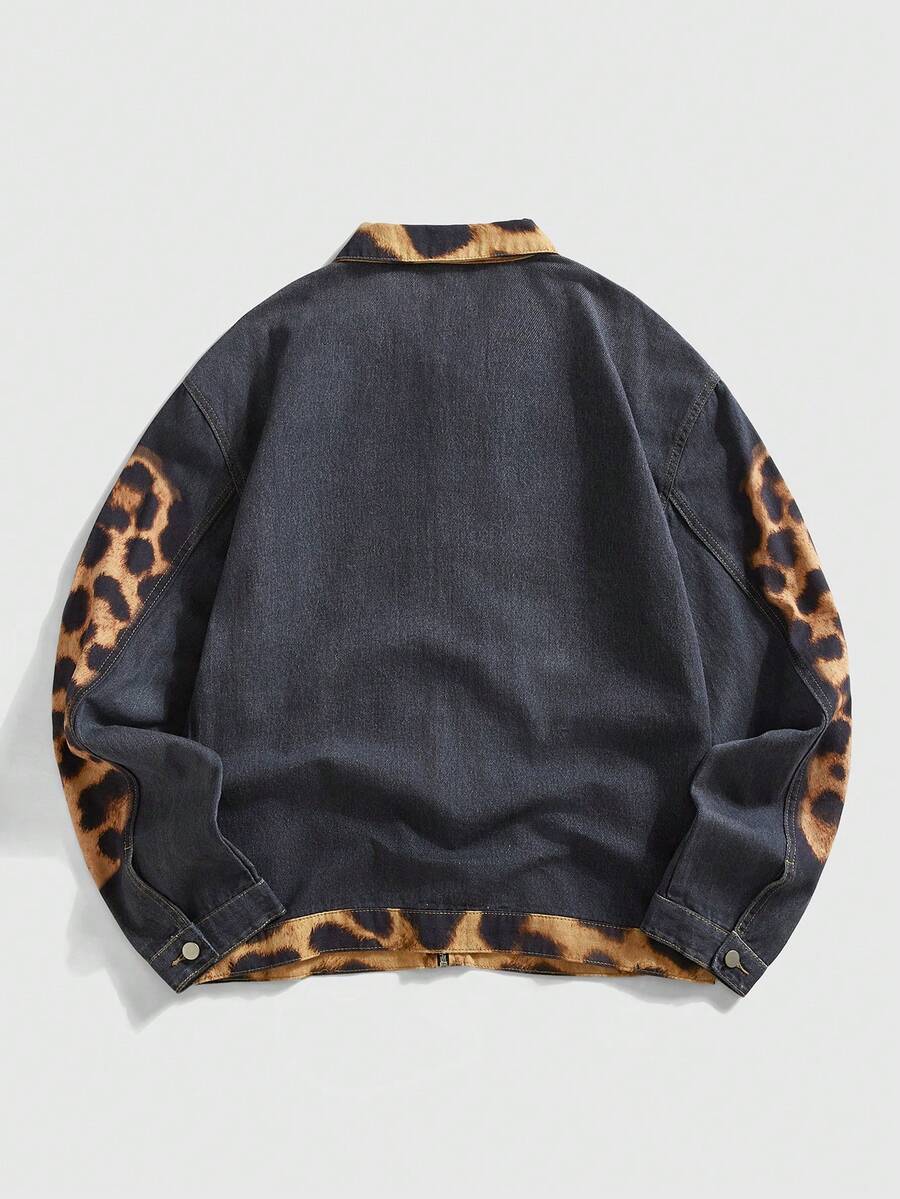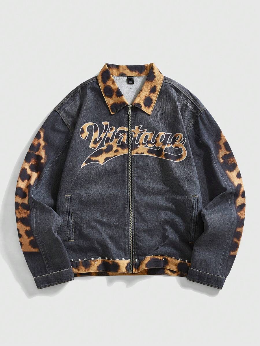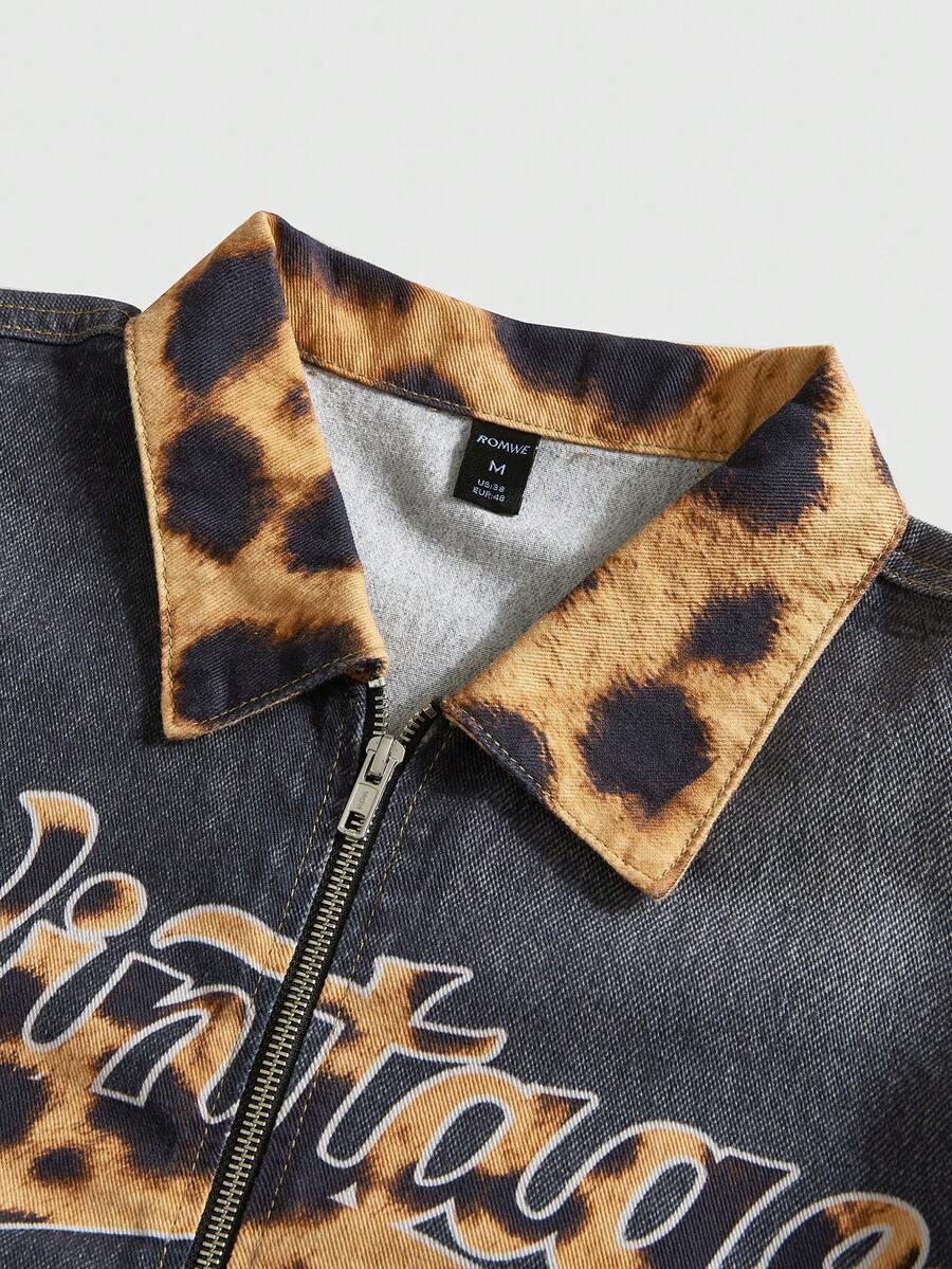 Street Life Giacca di jeans casual con chiusura lampo, con stampa leopardata e grafica a lettere, per uomo, autunnale