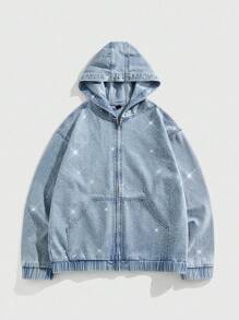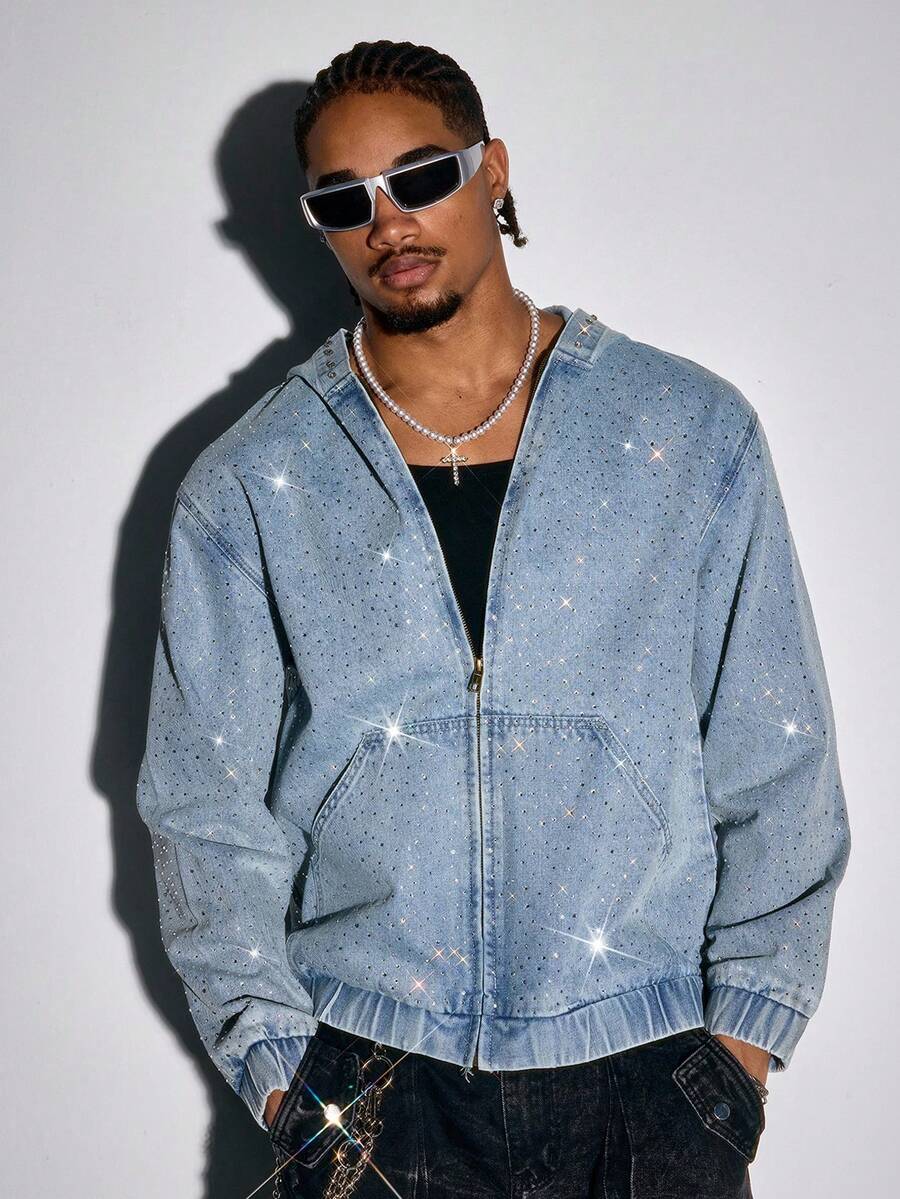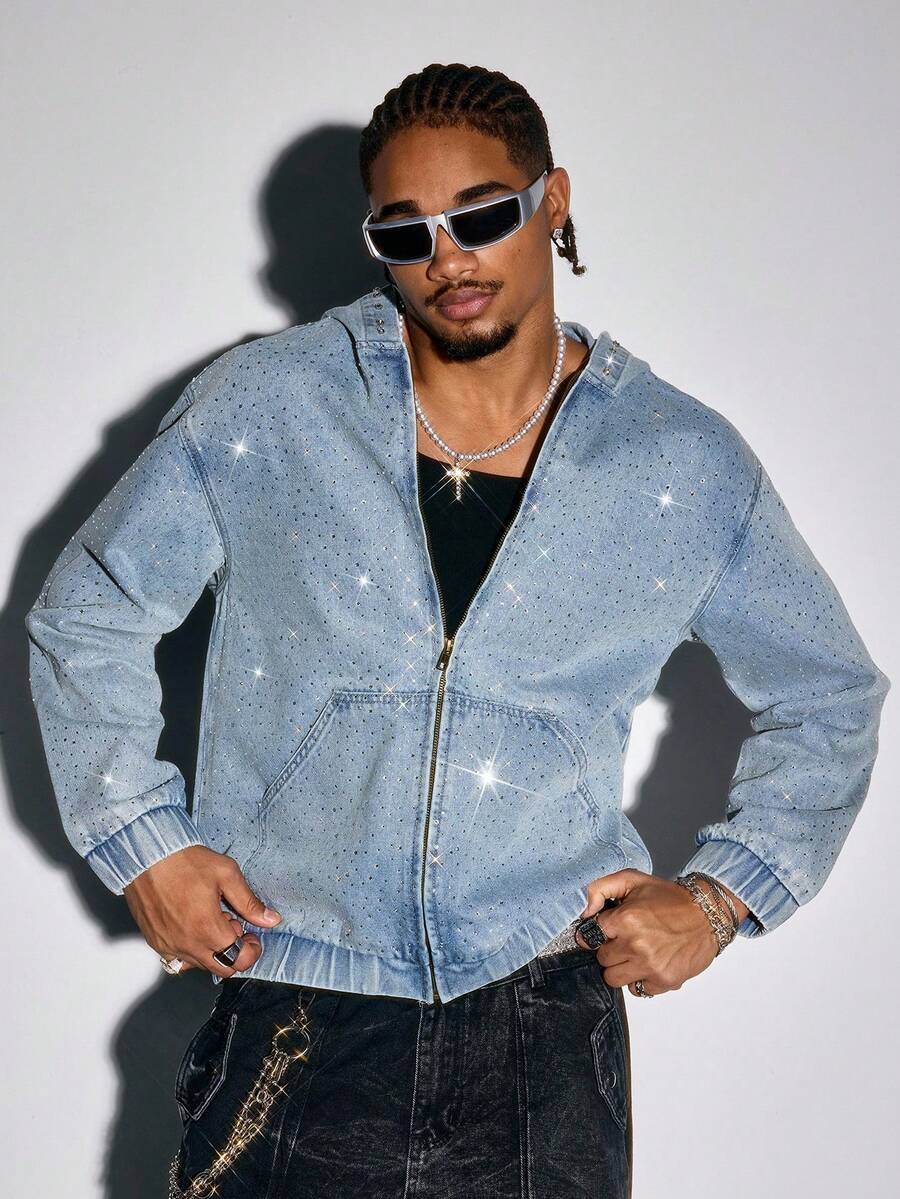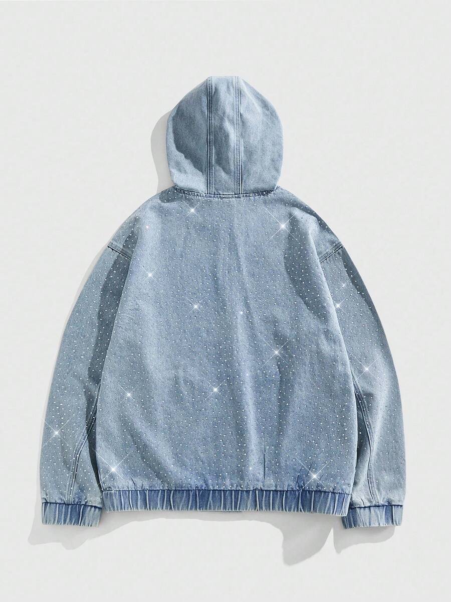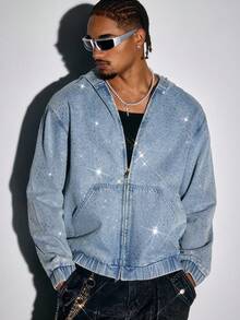 Street Life Giacca con cappuccio in denim con colletto, zip, tasche e dettagli in strass, manica lunga, per uomo, adatta all'autunno