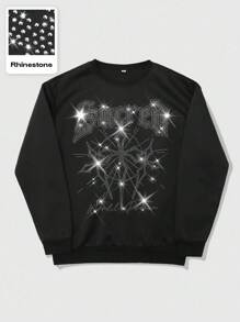 Street Life Felpa girocollo nera da uomo con design decorato con strass, adatta per autunno/inverno