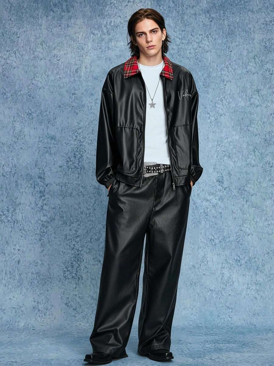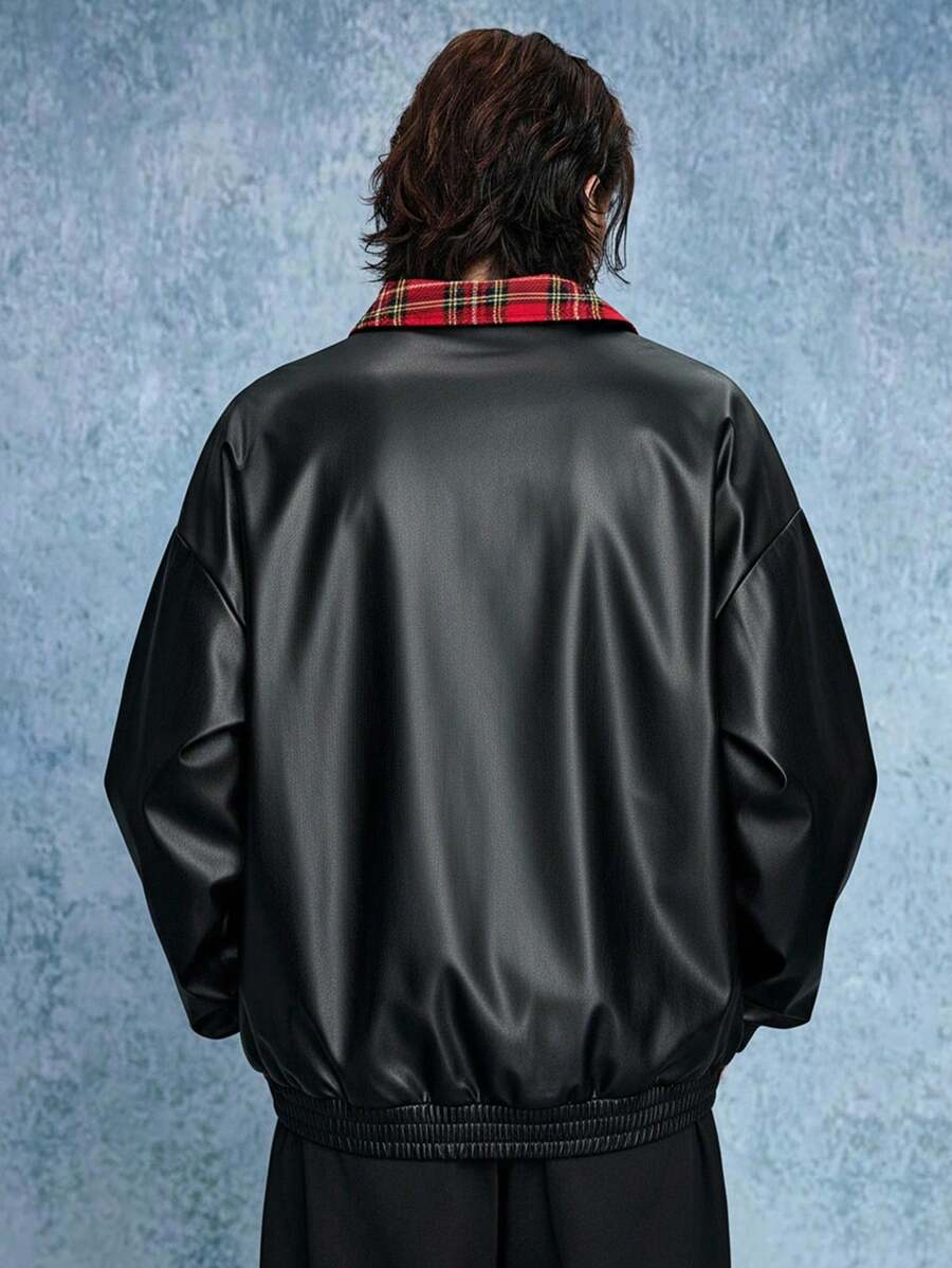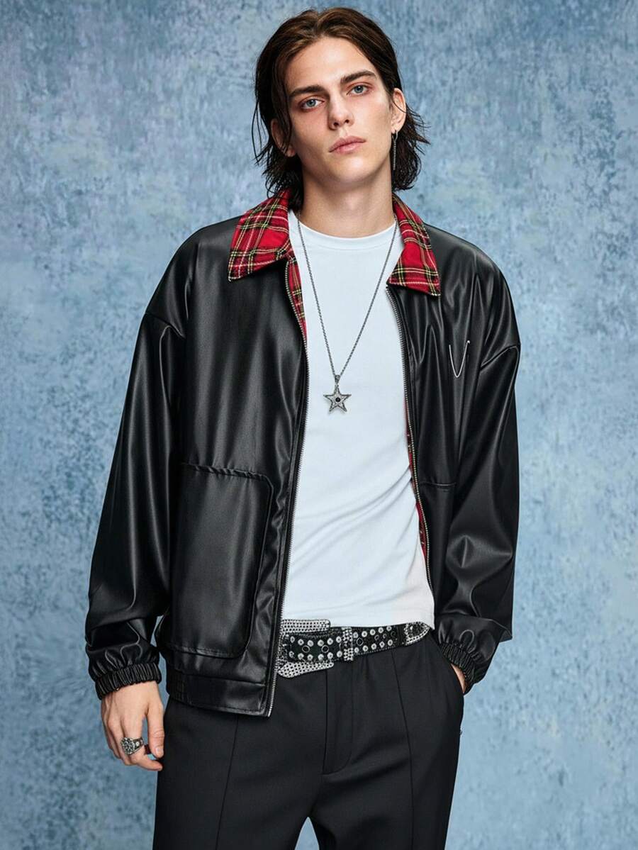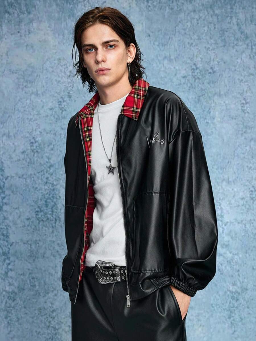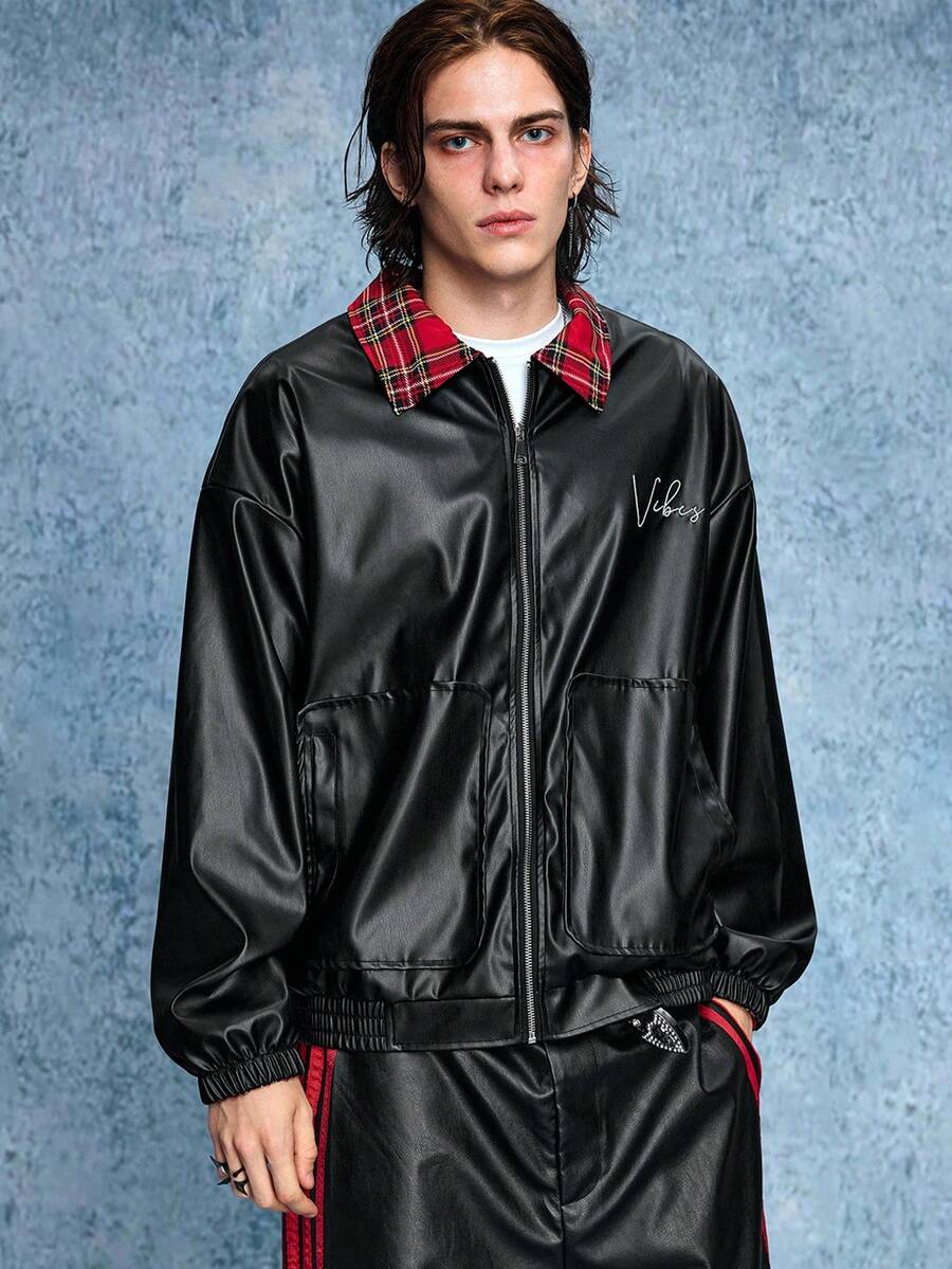 Street Life Giacca di pelle casual da uomo in stile moda di strada e universitario, con ricamo a lettere, patchwork a quadri e chiusura lampo sul colletto, adatta per l'autunno