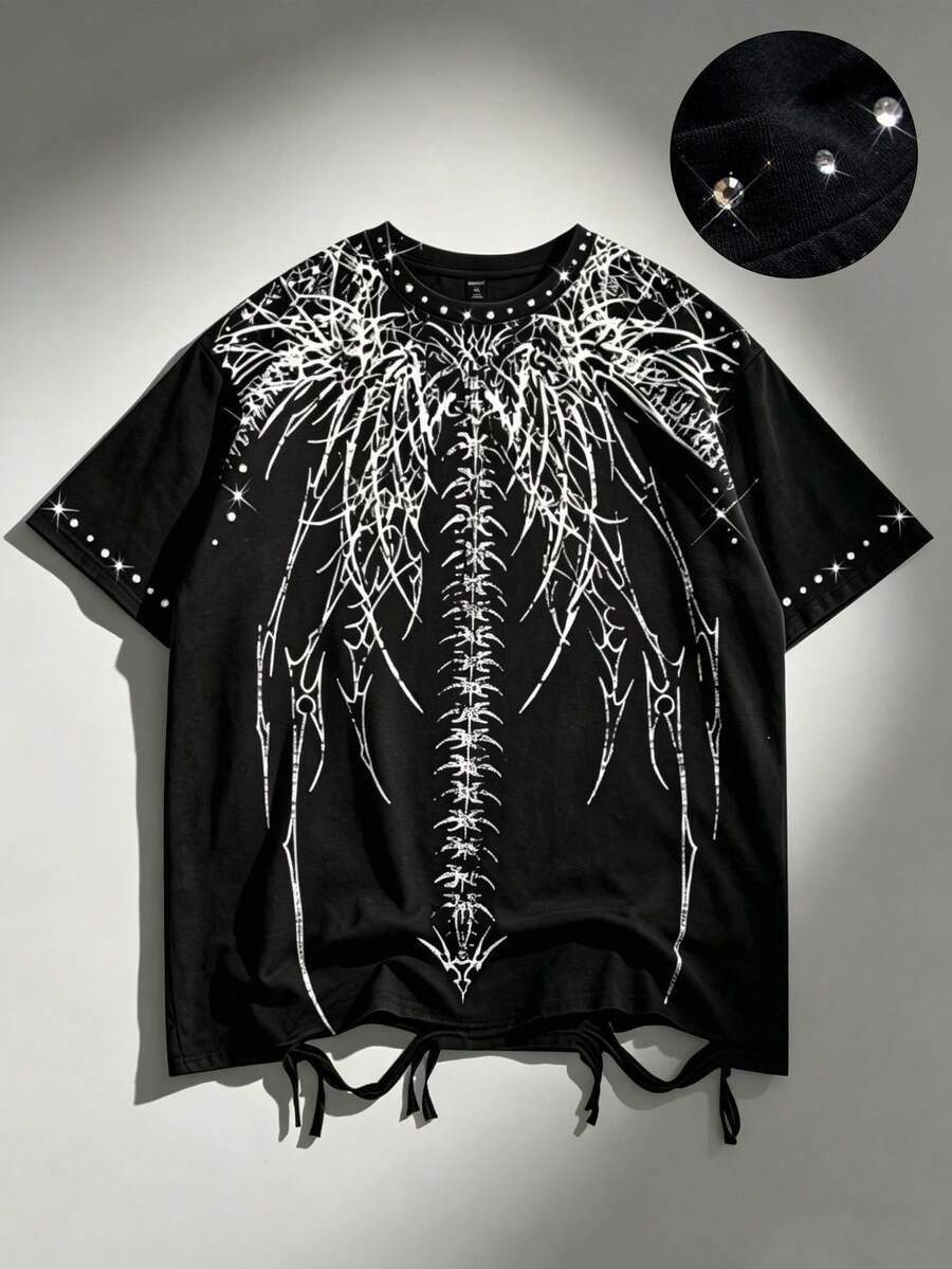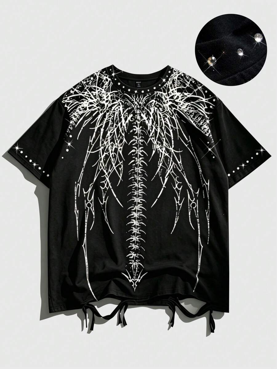 Street Life maglietta casual da uomo a maniche corte, stile punk artistico con strass e effetto consumato