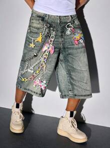 Street Life Pantaloncini di jeans casual da uomo, stile da strada, con stampa a catena, larghi, estivi