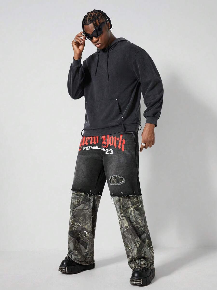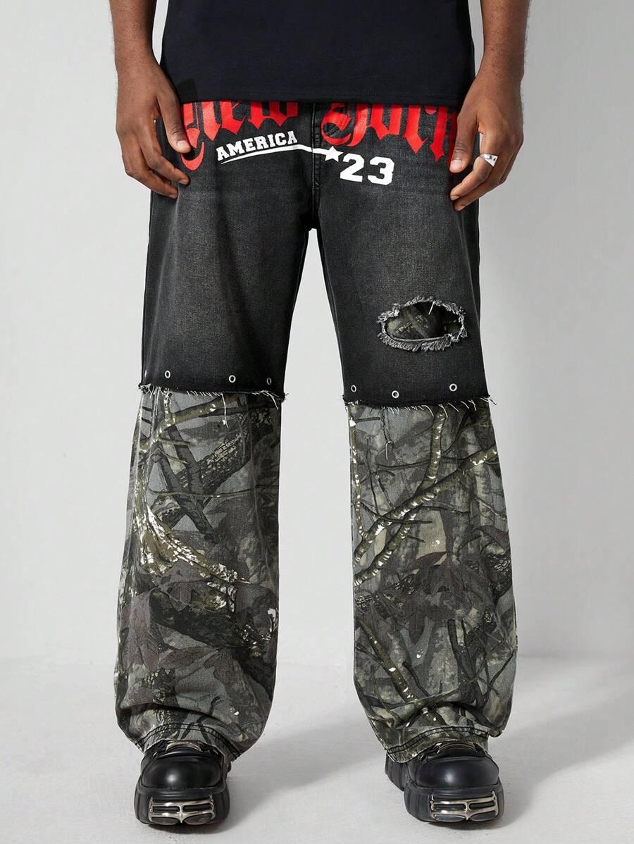 Street Life Jeans casual da uomo, stile streetwear, stampa con lettera e albero, orlo grezzo, linea dritta, 2 in 1